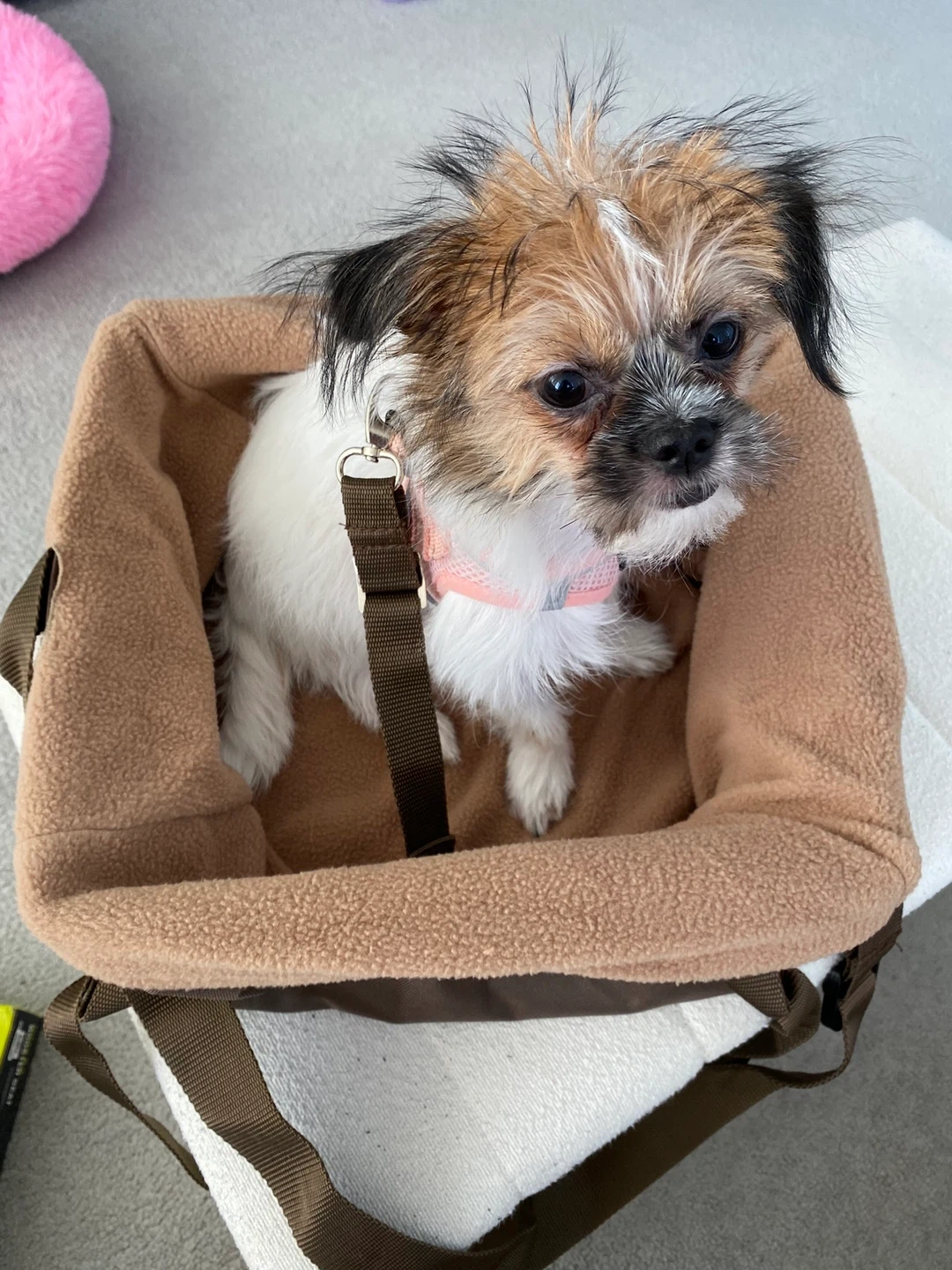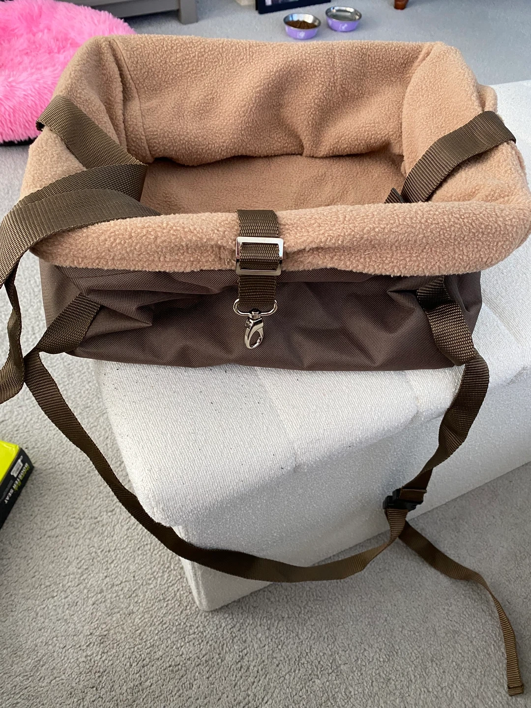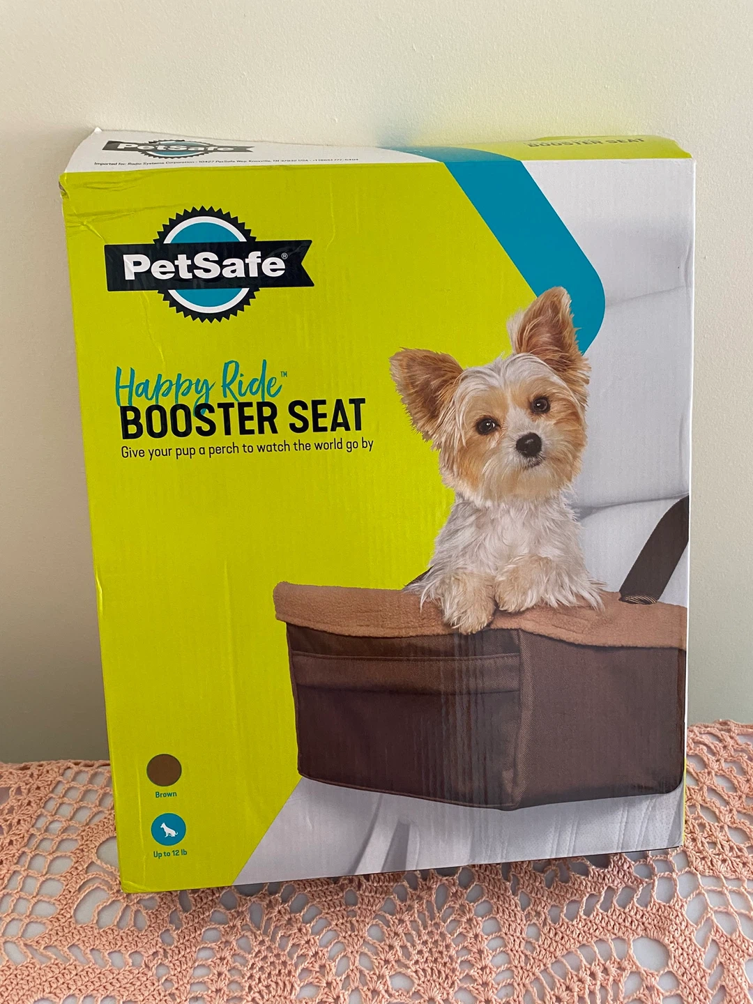 This PetSafe Happy Ride Booster Seat is designed for small dogs. It's a brown booster seat with adjustable straps for securing your pet. This is new (out of box) to show the size. It is a little small for my pup. This car booster seat would fit a puppy up to 7 lbs. Size 14”L x 12”W x 8”H