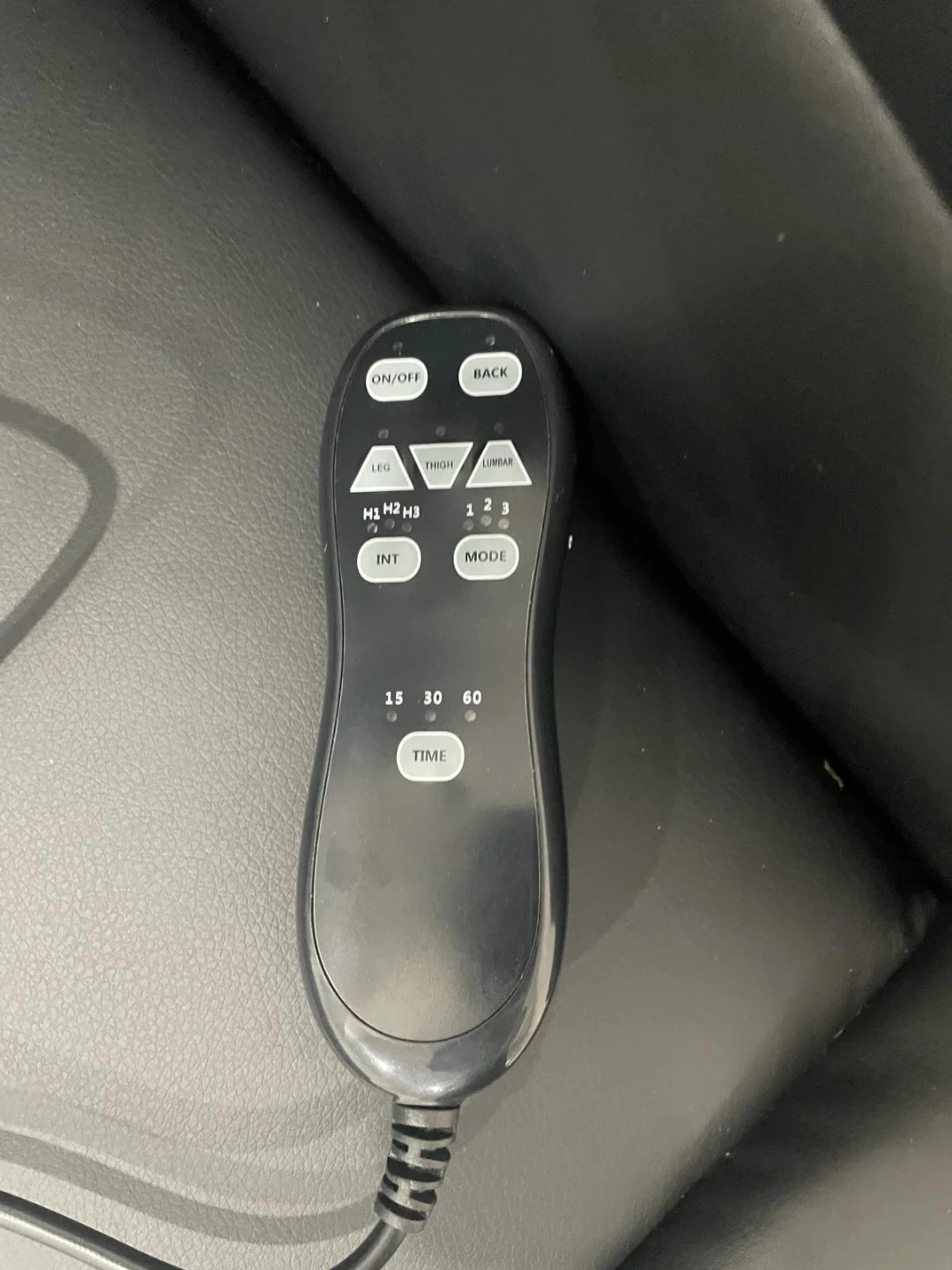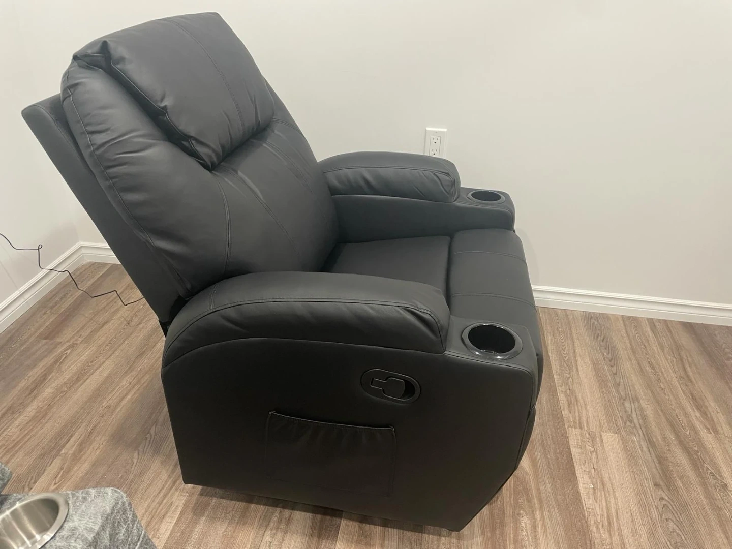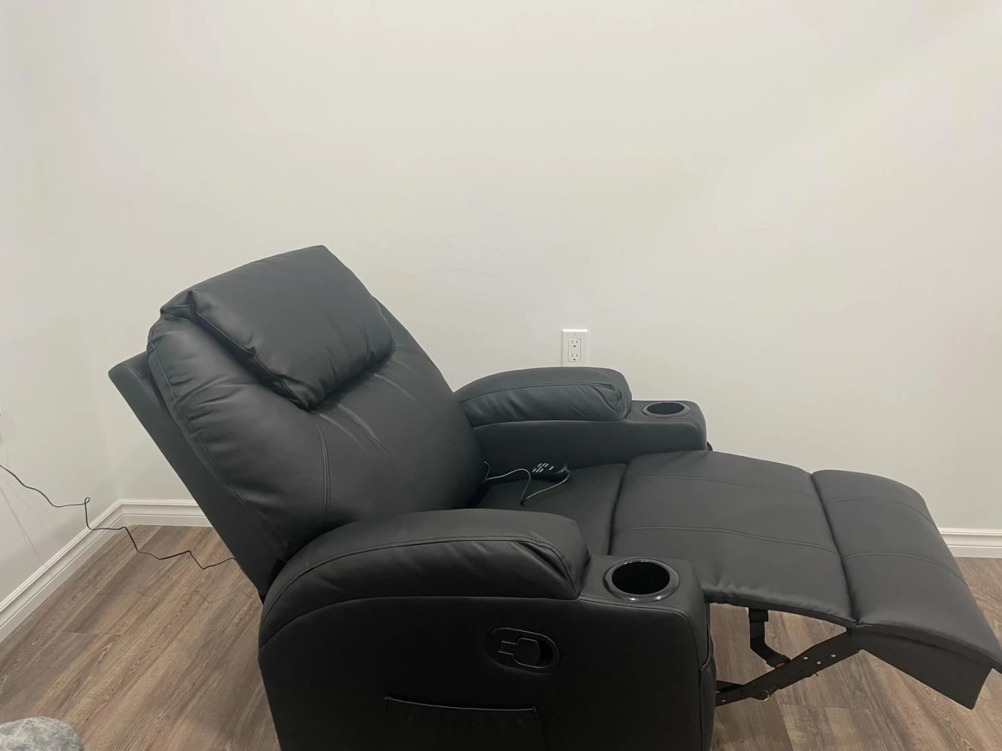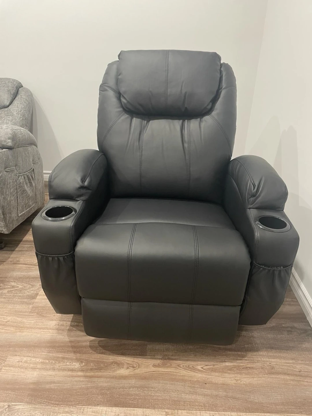 Black faux leather power recliner chair with 8 point massager and swivel action.