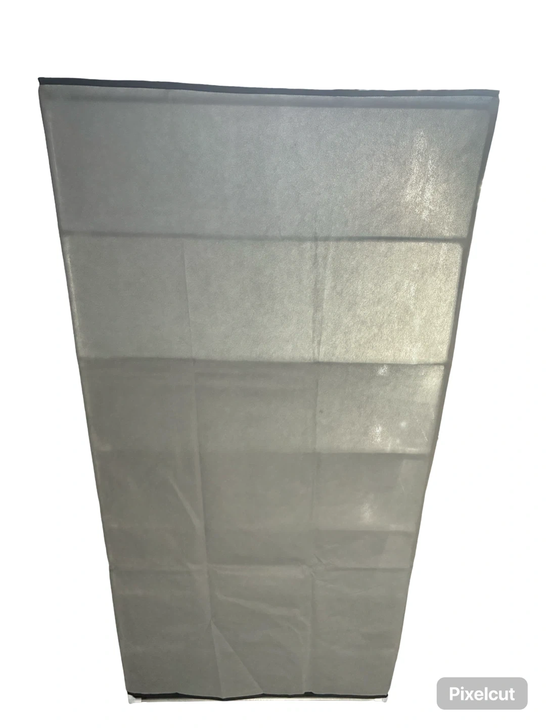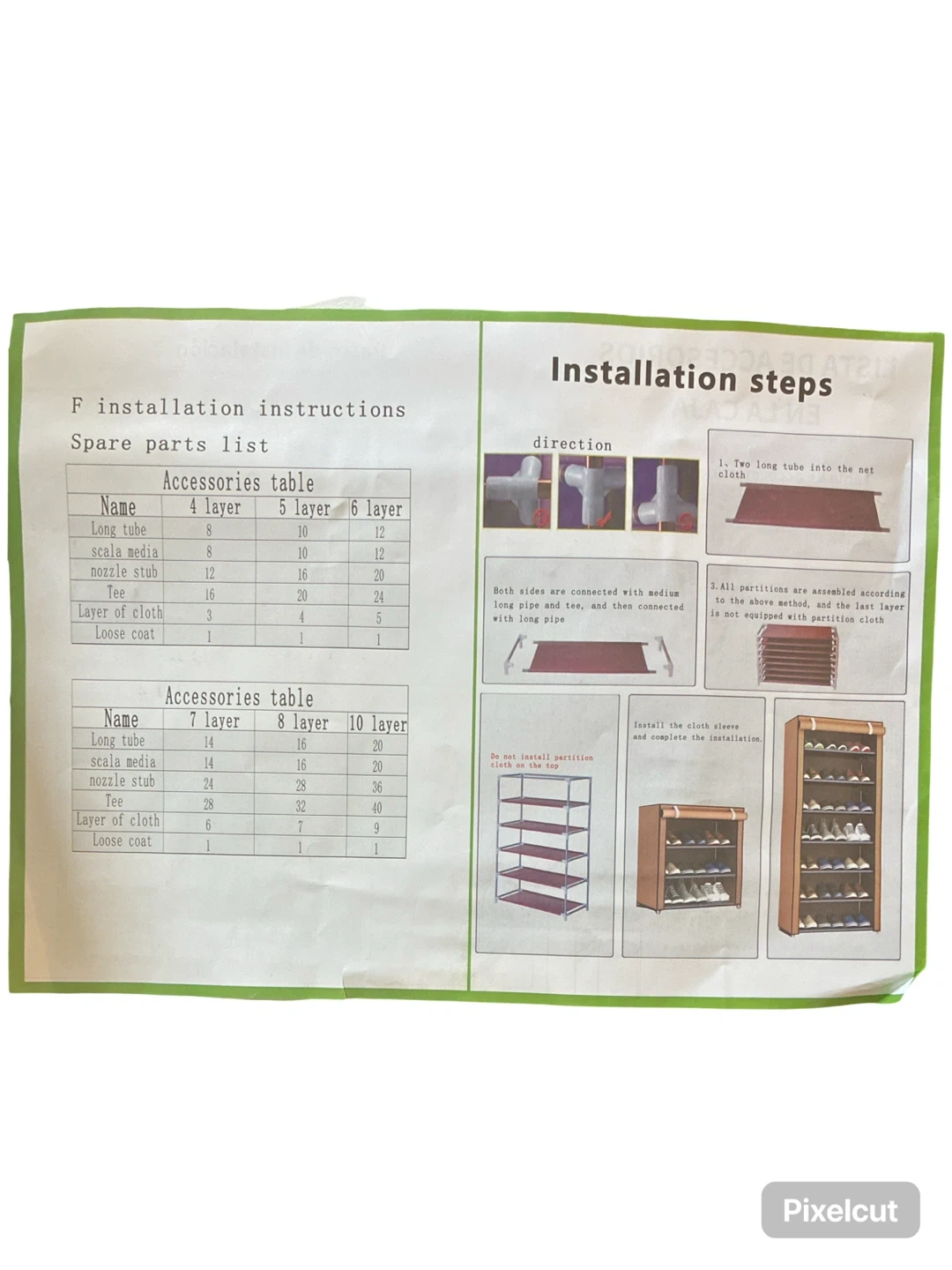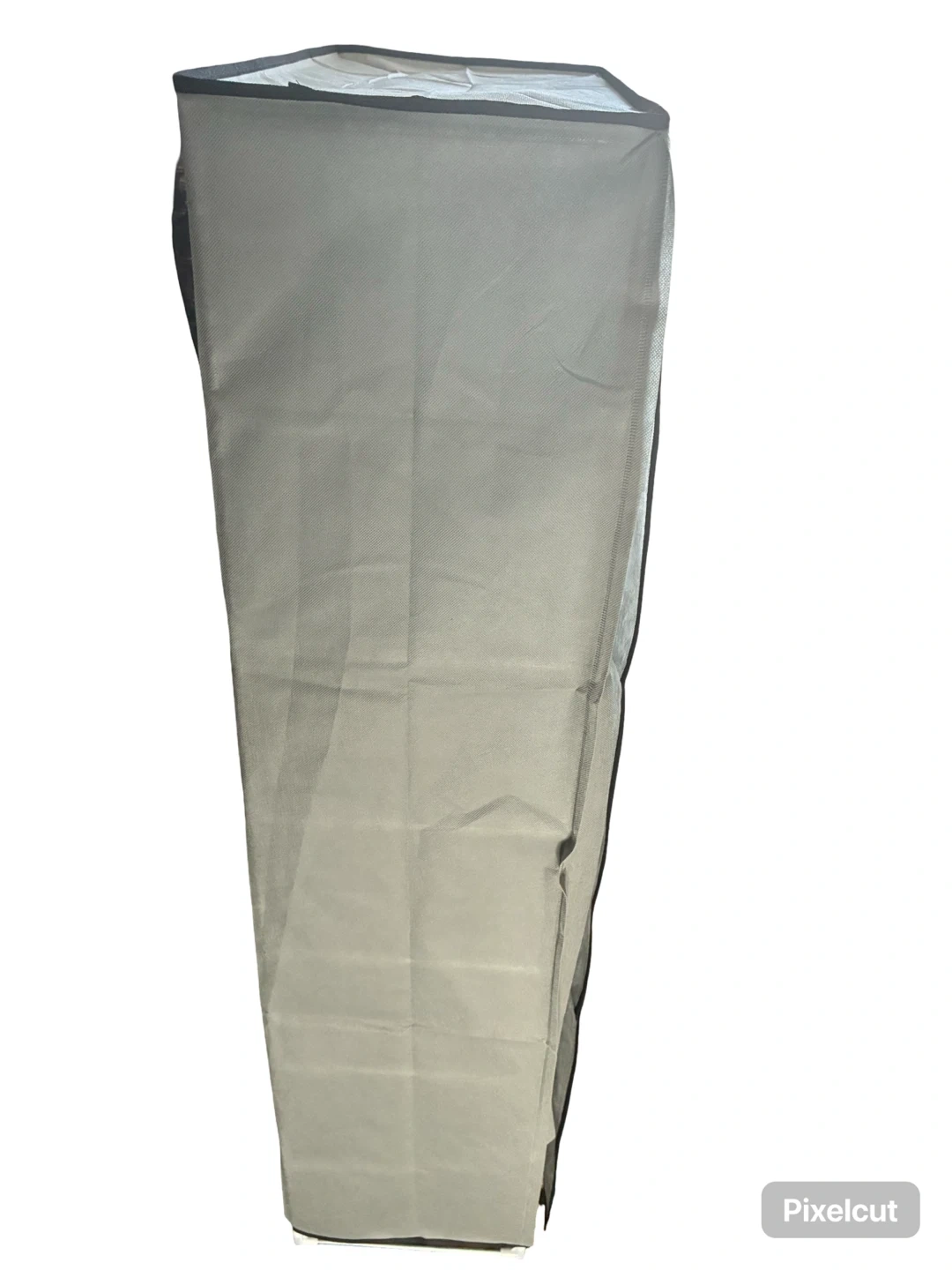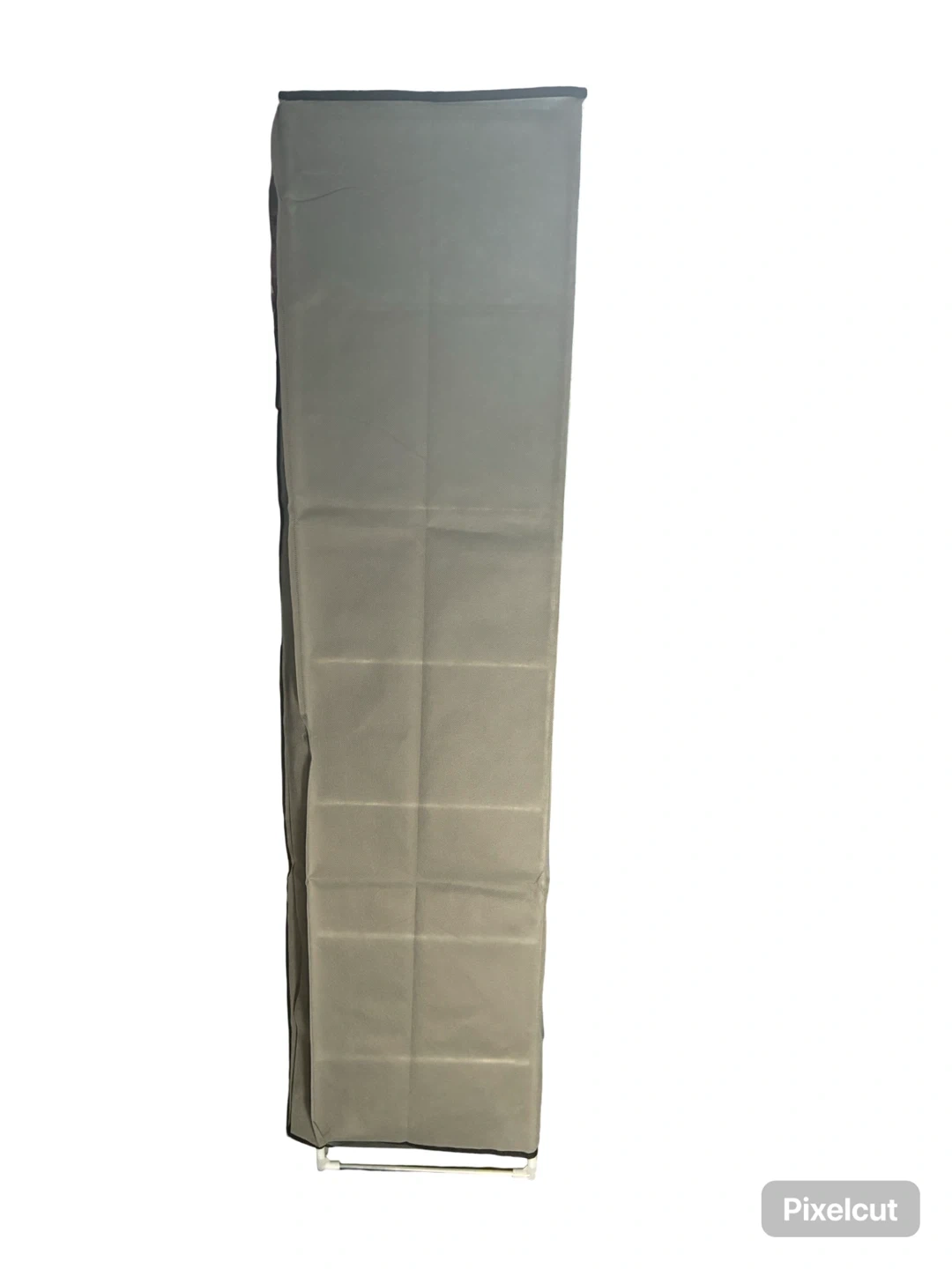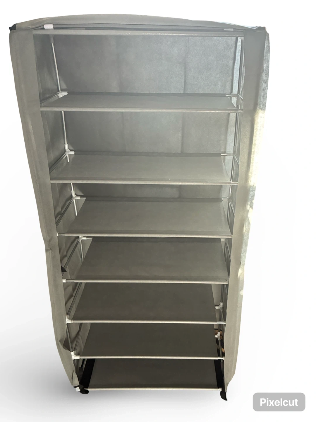 This is an 8-tier storage shelf with a gray fabric cover. It's perfect for organizing shoes or other items in your home. The shelves are made of non-woven fabric with metal poles.