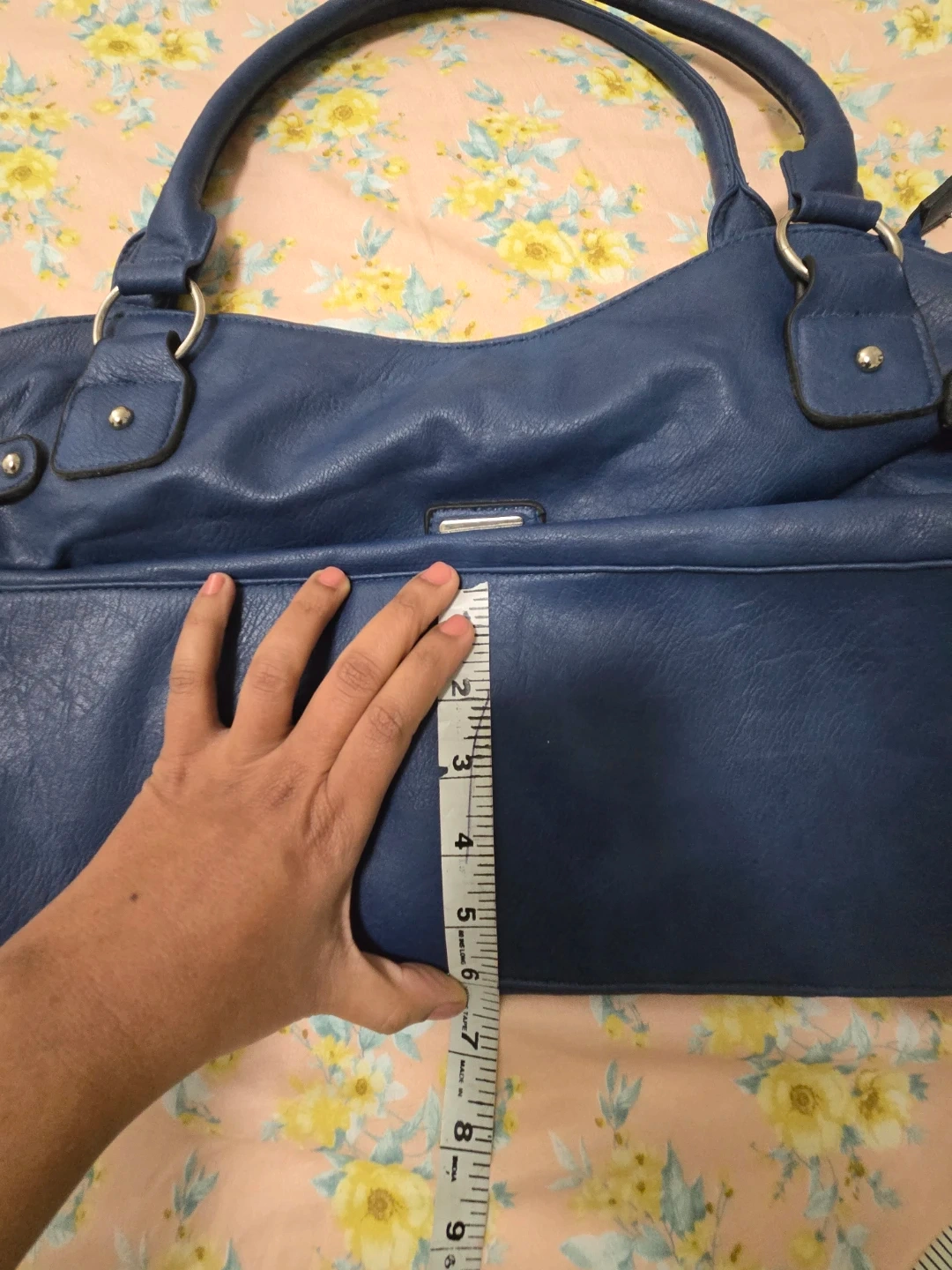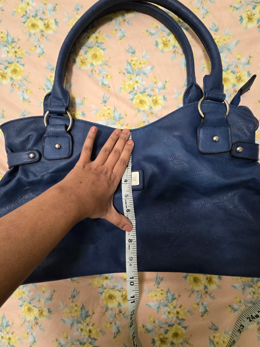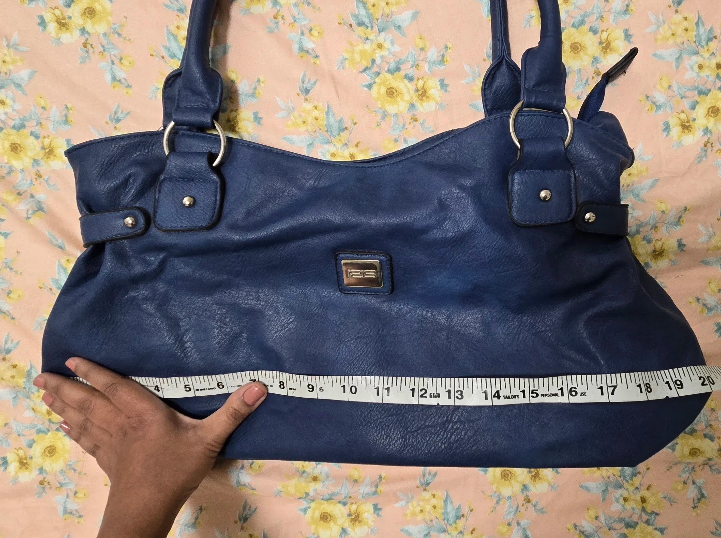 Here's a lovely blue tote bag! It measures approximately 20 inches in length and 9 inches in height. It's in great condition and ready for a new owner.