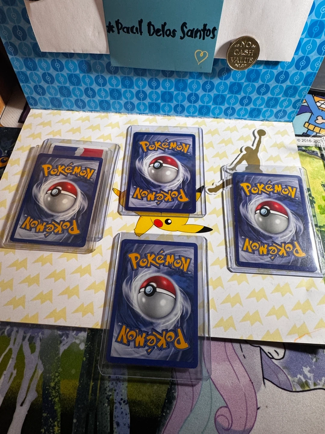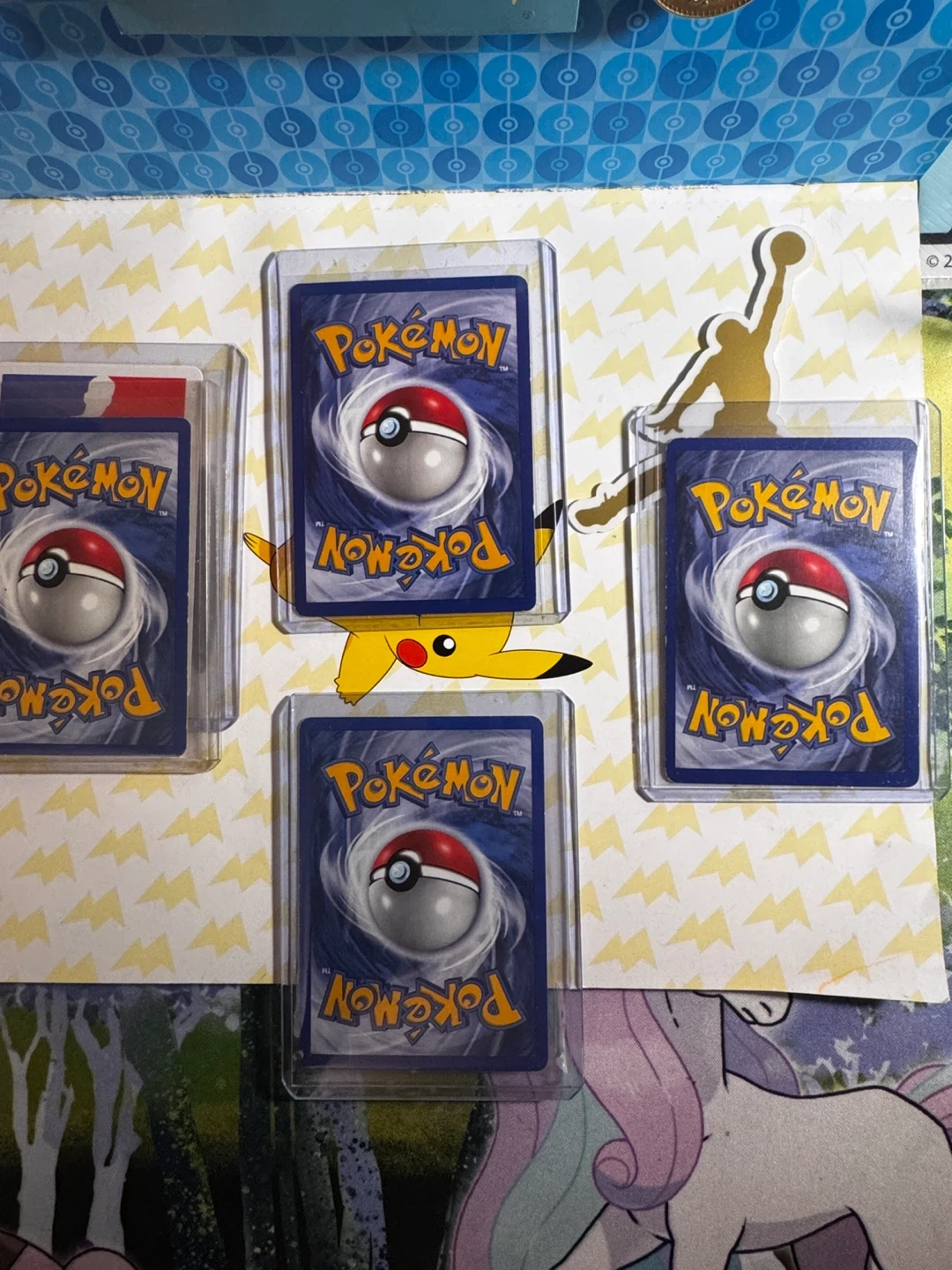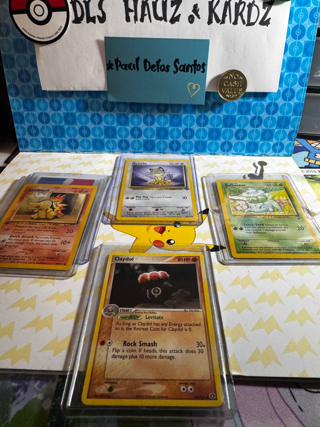 Four Pokemon trading cards are featured, including Cyndaquil, Meowth, Bulbasaur, and Claydol. Each card is housed in a protective sleeve.