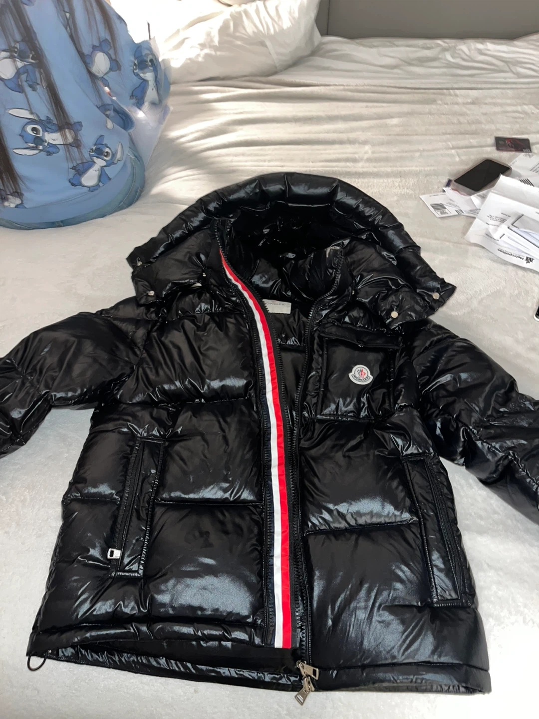 This is a shiny black Moncler puffer jacket. It features the iconic Moncler logo on the chest pocket. A red, white, and blue stripe accents the front zipper. This jacket is well-insulated and perfect for cold weather!