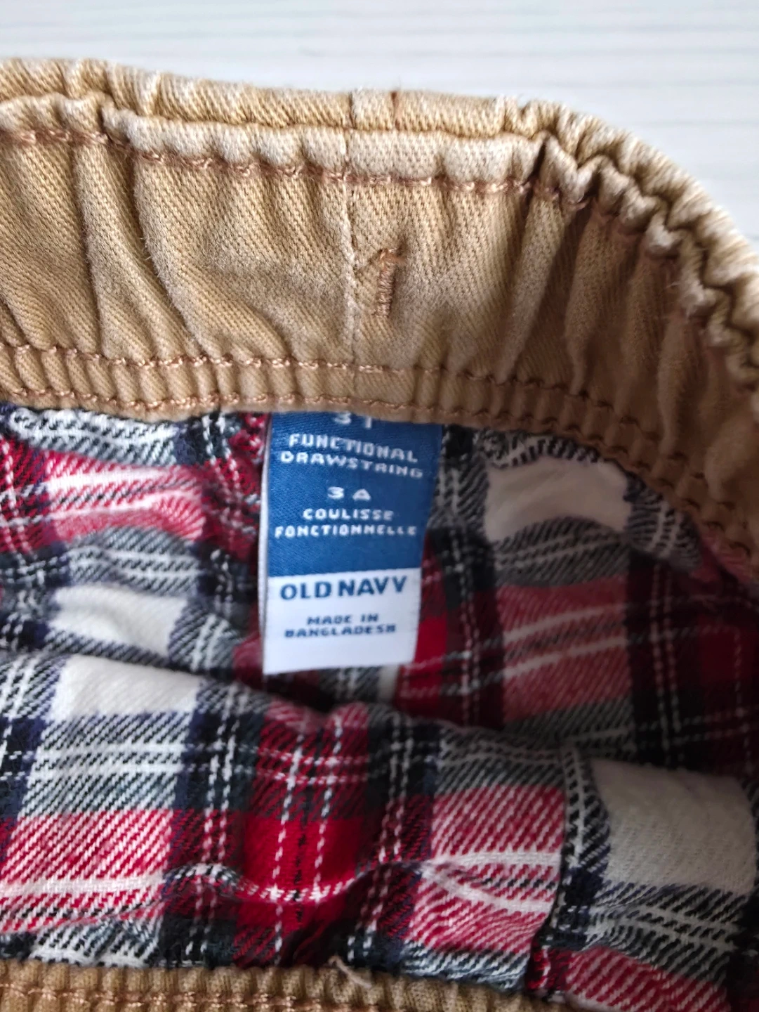 These Old Navy pants are size 3A and feature a functional drawstring. They're lined with a cozy flannel material, perfect for keeping your little one warm!