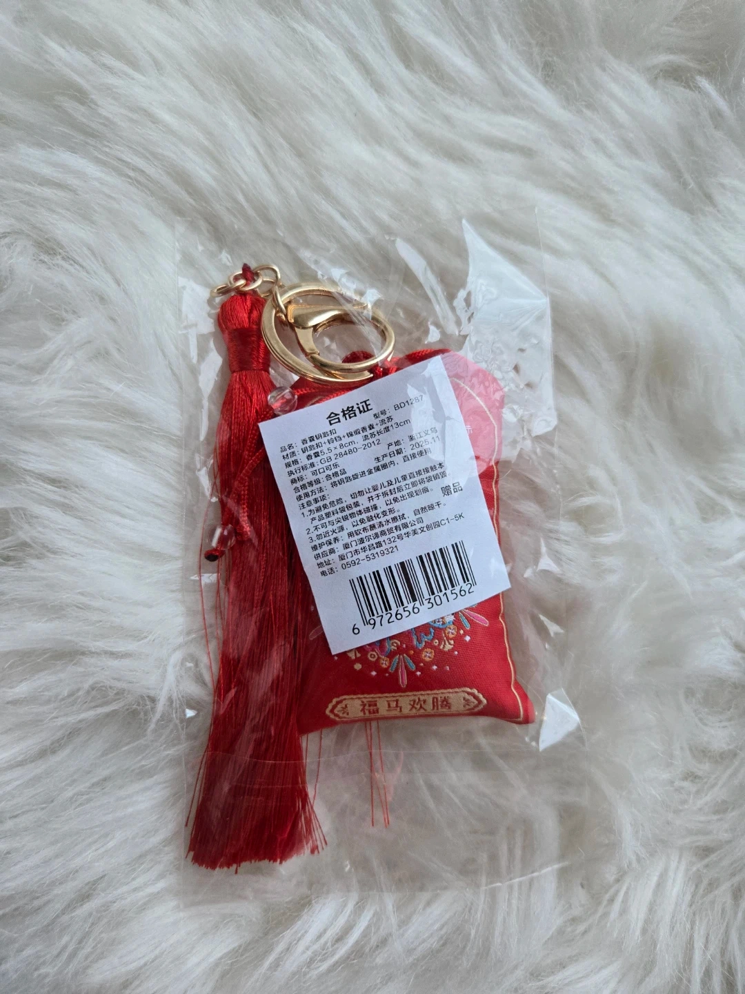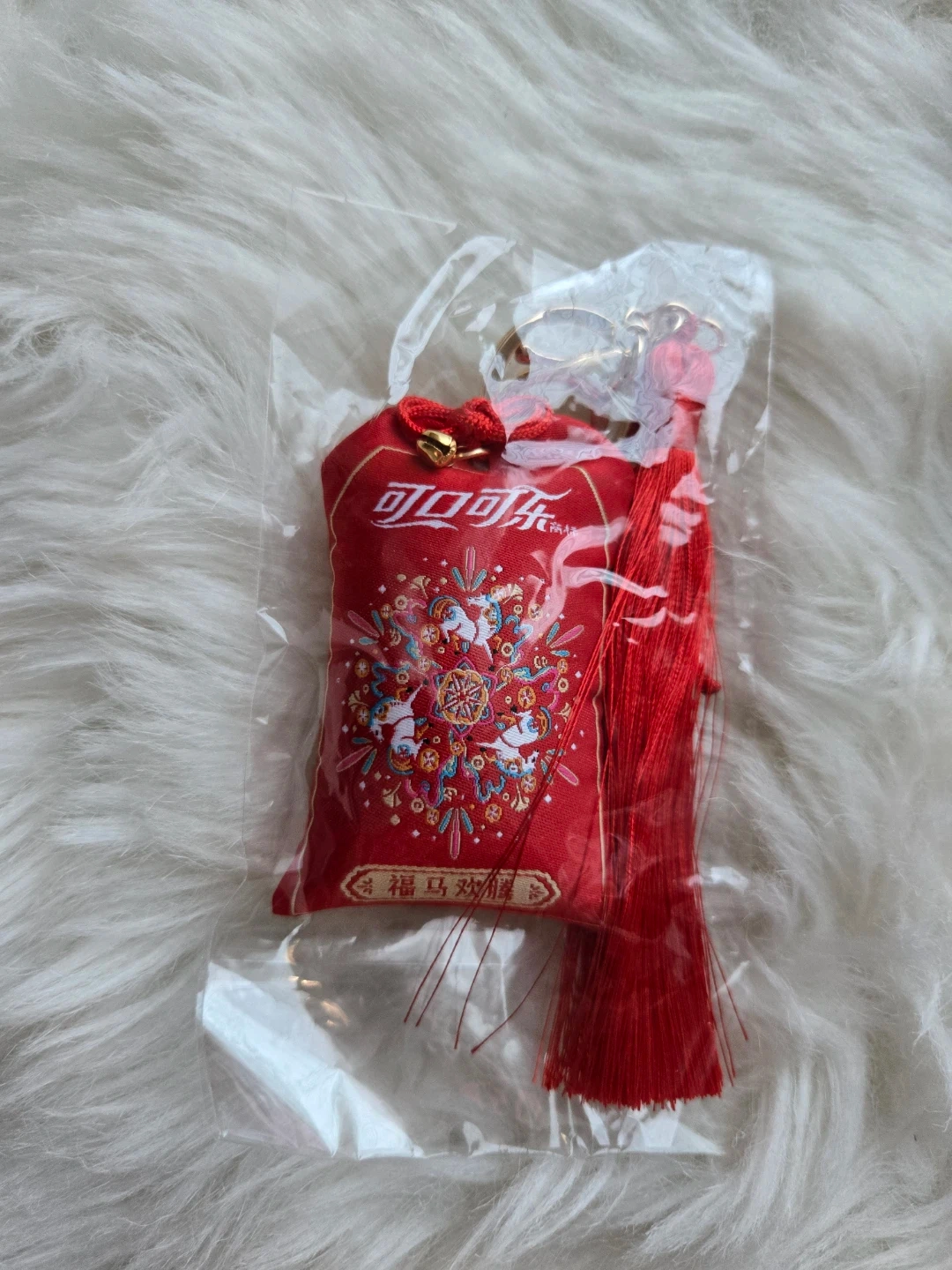 This is a Coca-Cola festive lunar new year keychain in red. It features a decorative tassel and a vibrant design. A great little accessory for your keys!