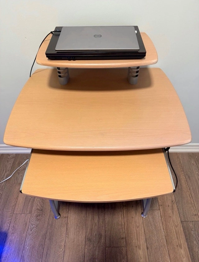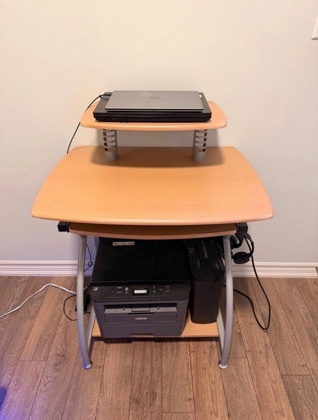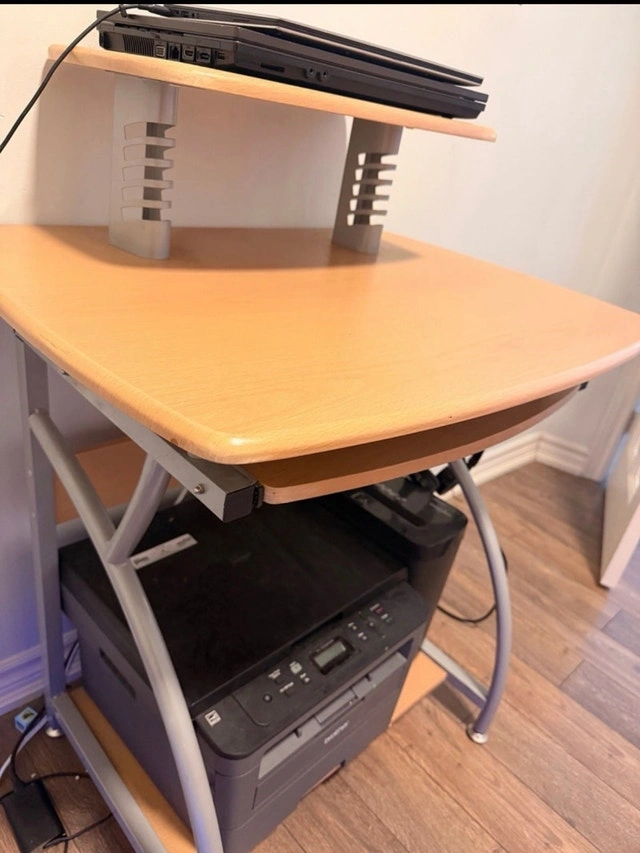 This computer desk is a versatile piece for any home office. It features multiple tiers, including a top shelf for a monitor or laptop, a main work surface, and a lower shelf perfect for a printer or other accessories. It is in used condition. Additional features include a compact design ideal for small spaces, a pull-out keyboard tray, and a sturdy metal frame with wooden surfaces. Asking $40. If you're seeing this ad, yes, it's still available!
