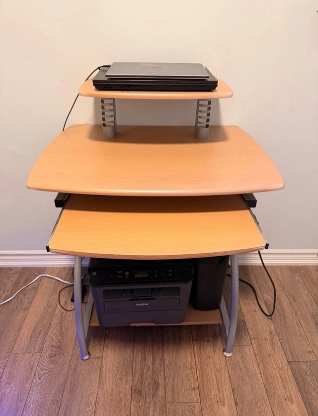 This computer desk is a versatile piece for any home office. It features multiple tiers, including a top shelf for a monitor or laptop, a main work surface, and a lower shelf perfect for a printer or other accessories. It is in used condition. Additional features include a compact design ideal for small spaces, a pull-out keyboard tray, and a sturdy metal frame with wooden surfaces. Asking $40. If you're seeing this ad, yes, it's still available!