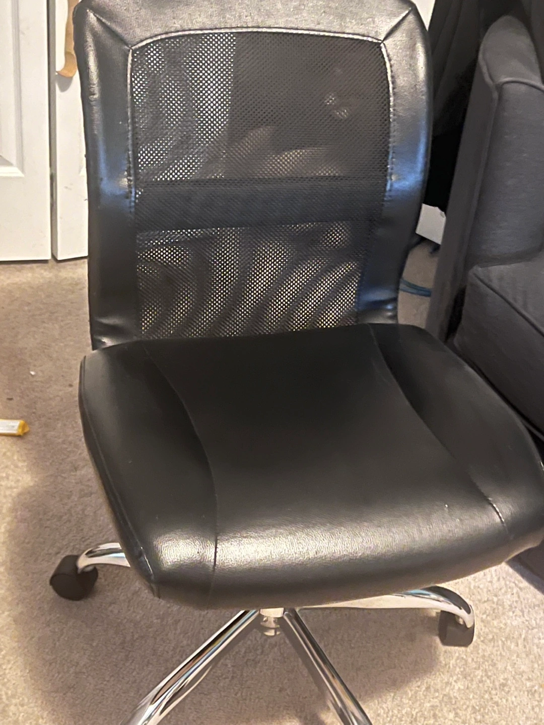 Black office chair with mesh back. Features chrome base and wheels.has some cat scratches on it but is perfectly in functional condition.