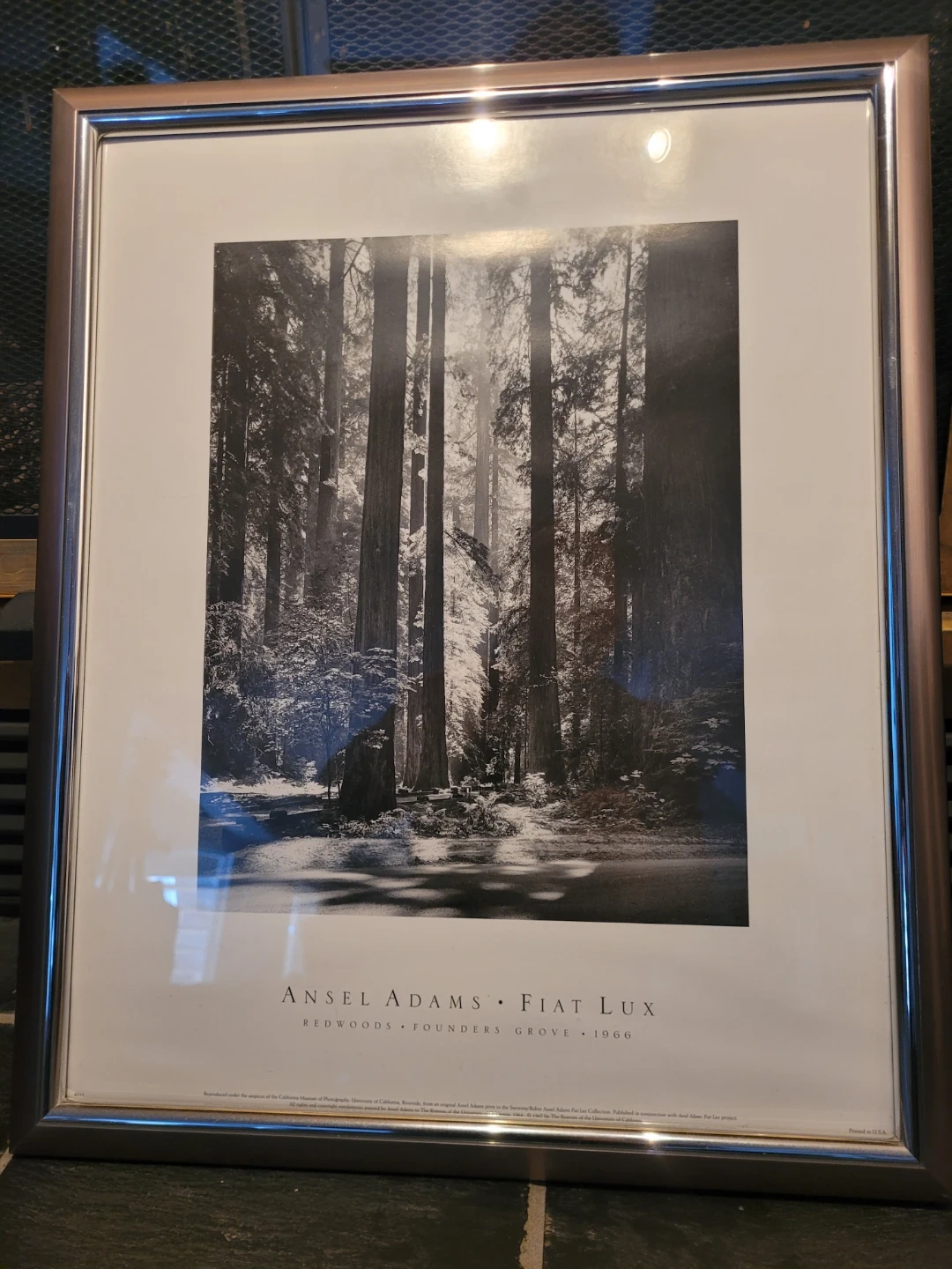 Framed print of Ansel Adams' "Fiat Lux," featuring Redwoods Founders Grove from 1966. The artwork is professionally framed with a sleek metallic border and white matting. A classic piece for any art or nature enthusiast!
