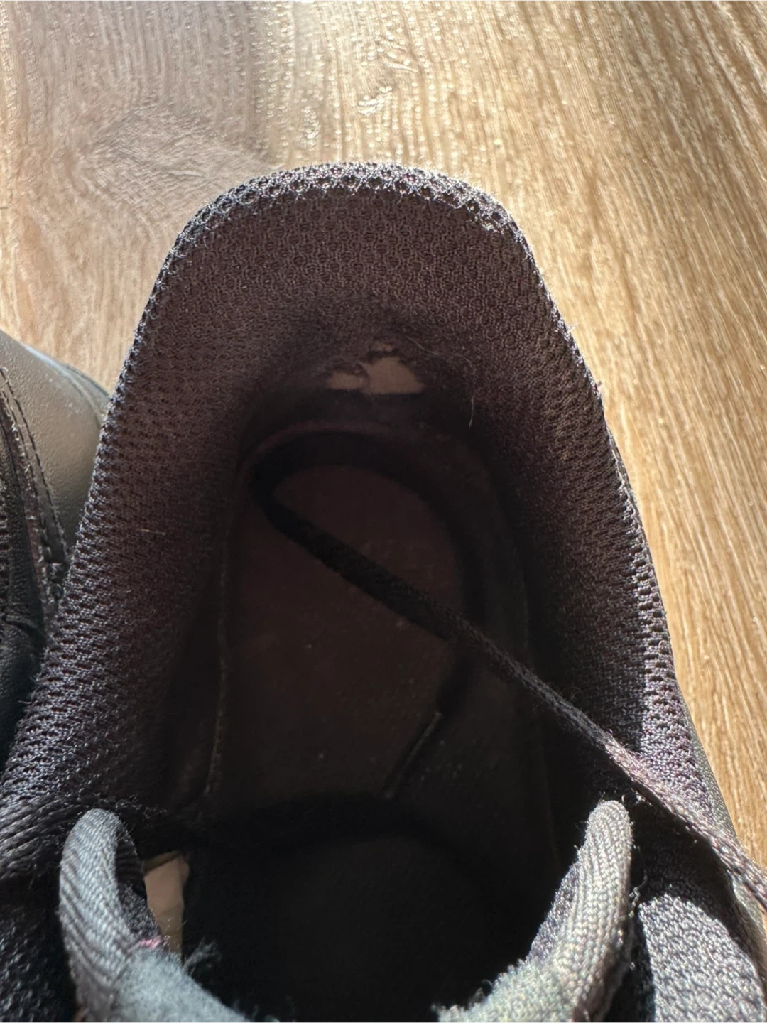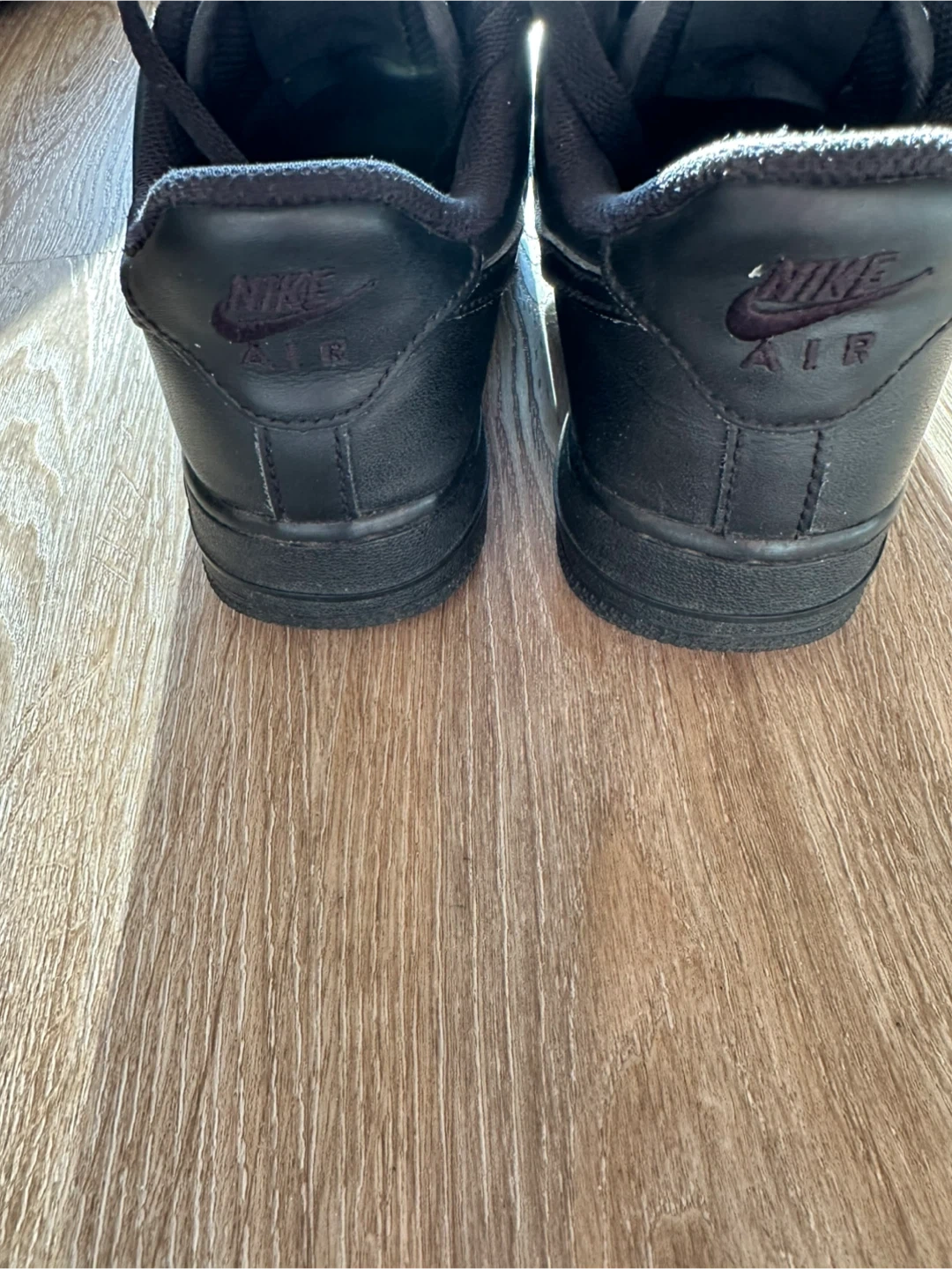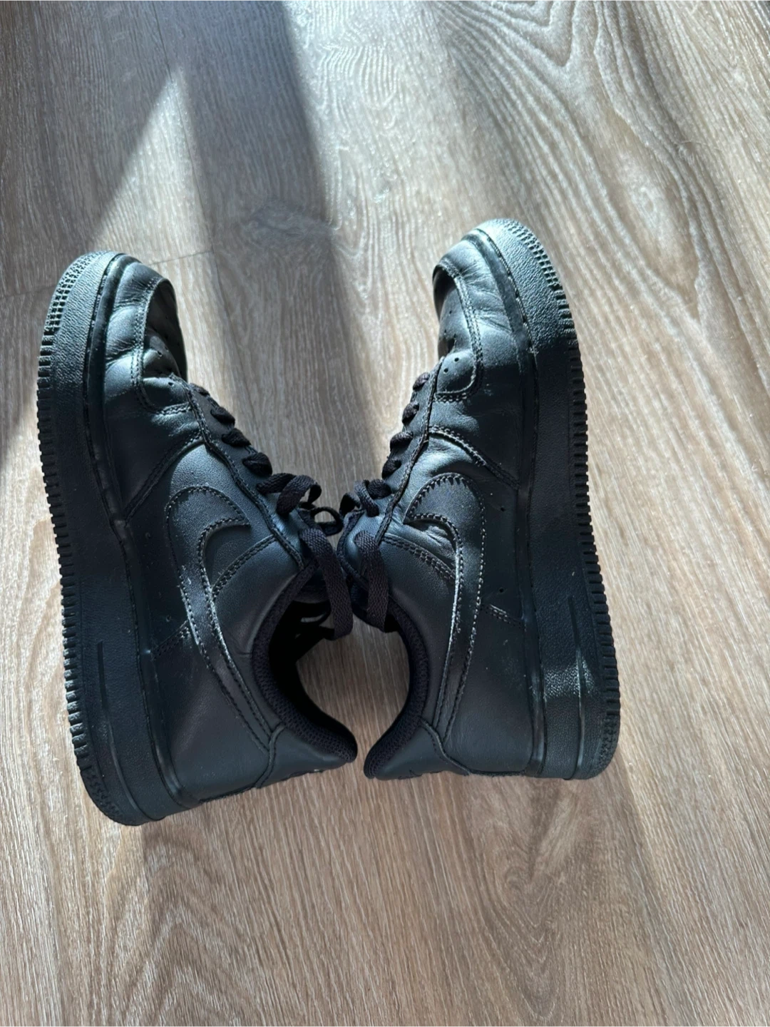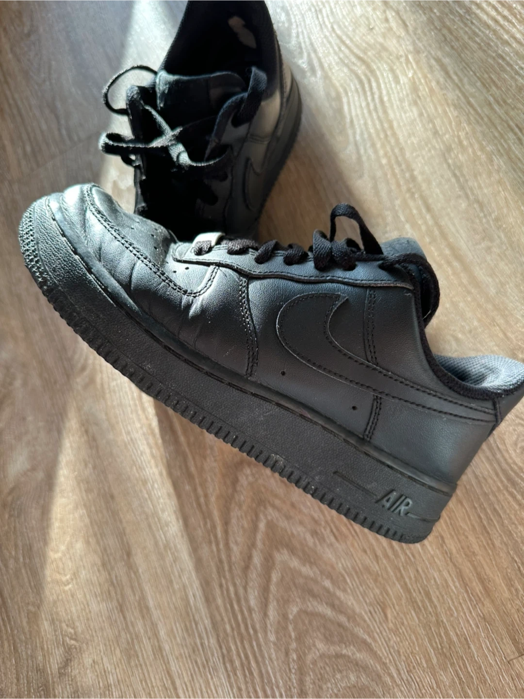 Classic black Nike Air Force 1 sneakers. These low-top kicks offer a timeless style. Leather upper with rubber sole for durability. Perfect for everyday wear or a sporty look!