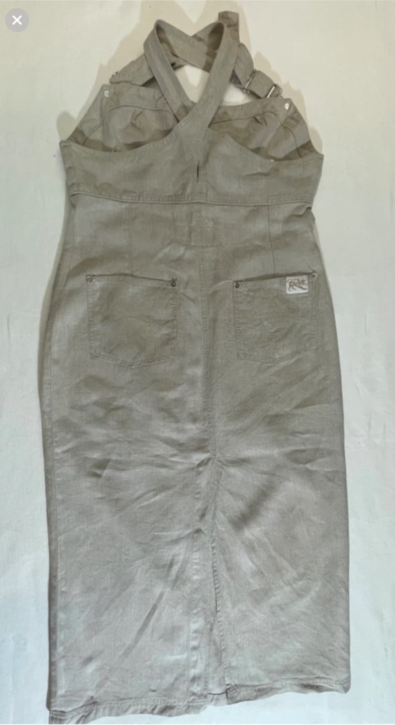 This stunning vintage Parasuco dress is crafted from 100% natural linen and features a beautifully structured, timeless silhouette. Designed with a flattering button-front bodice and adjustable cross-back straps, this piece blends utility style with feminine elegance.