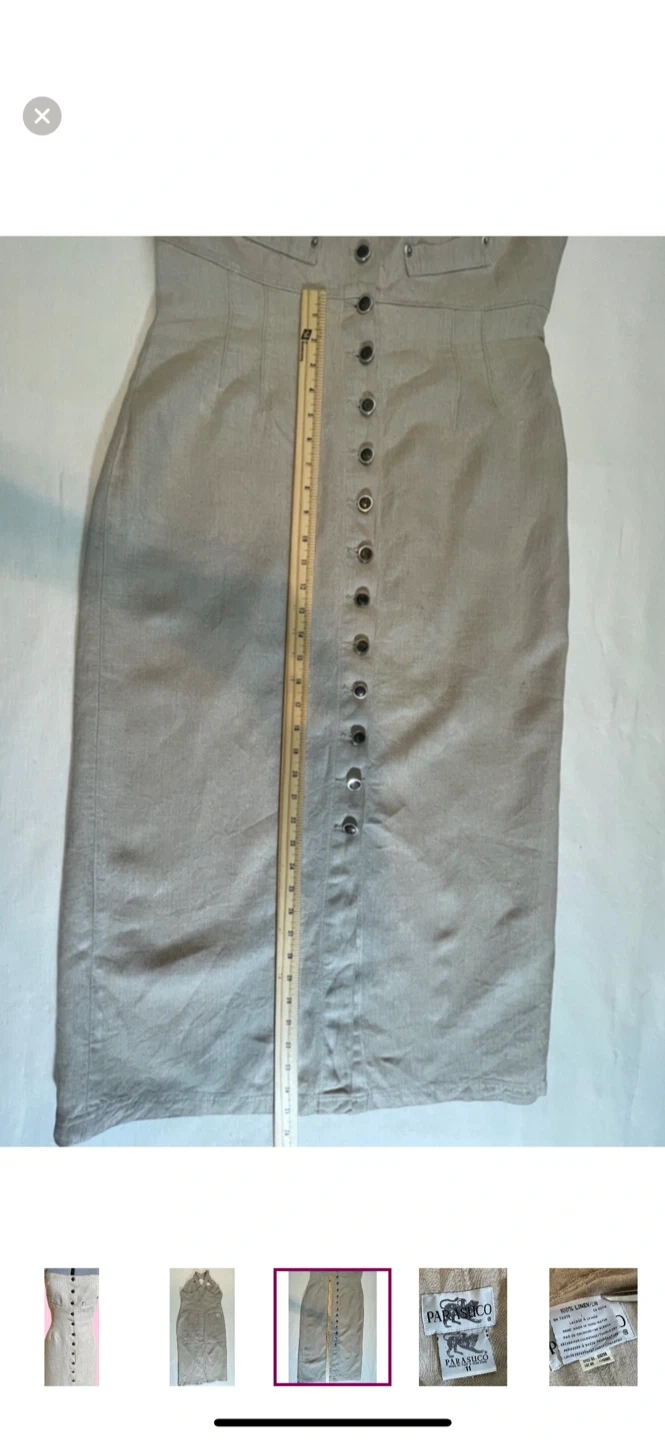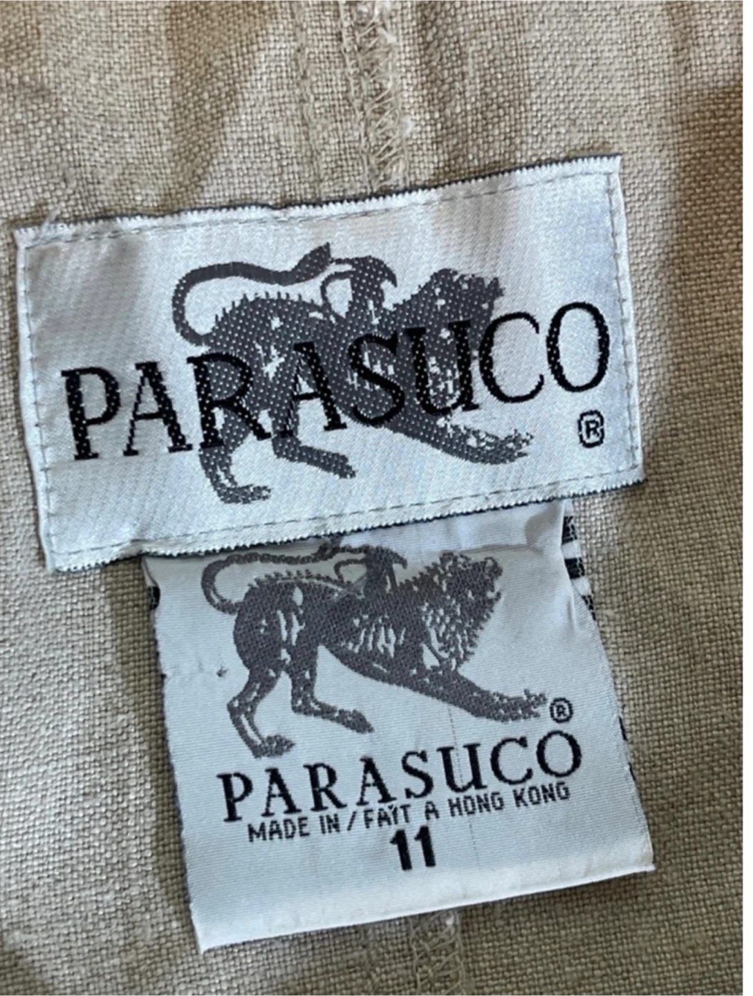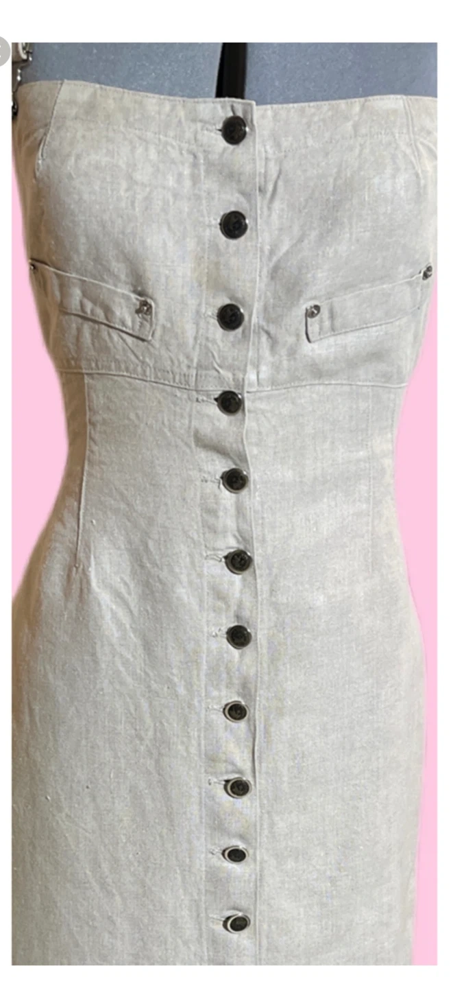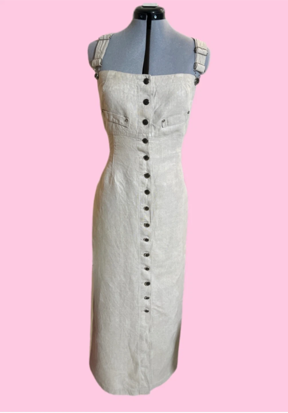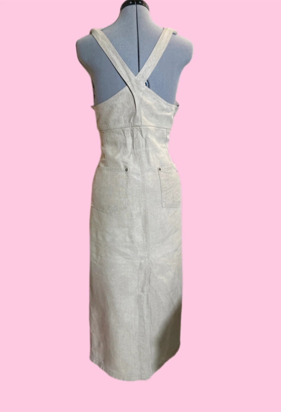 This stunning vintage Parasuco dress is crafted from 100% natural linen and features a beautifully structured, timeless silhouette. Designed with a flattering button-front bodice and adjustable cross-back straps, this piece blends utility style with feminine elegance.