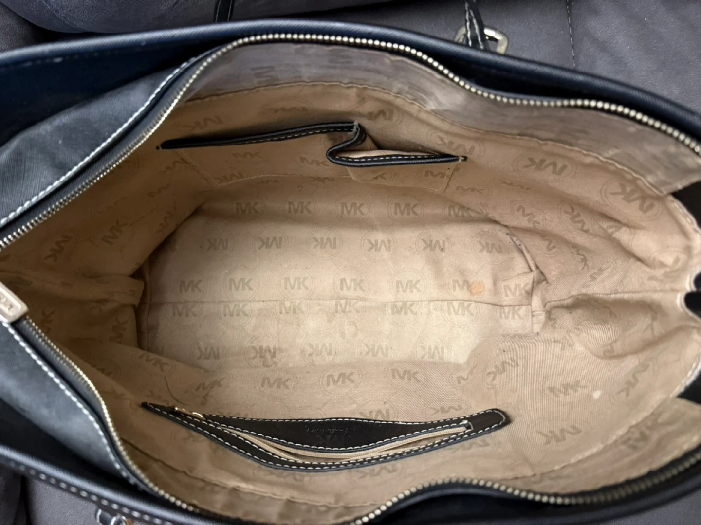 A classic black tote bag from Michael Kors. It's made of durable Saffiano leather and features signature gold-tone hardware. This spacious bag is perfect for everyday use, carrying essentials with ease.