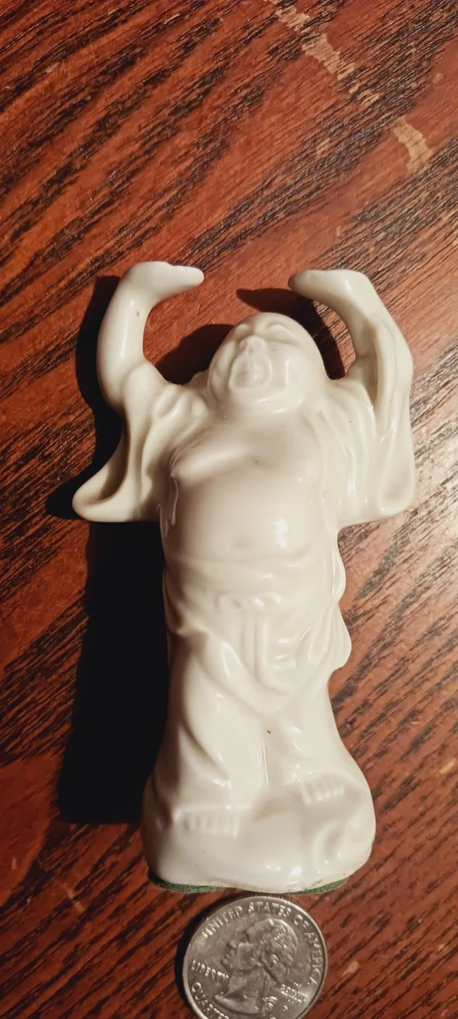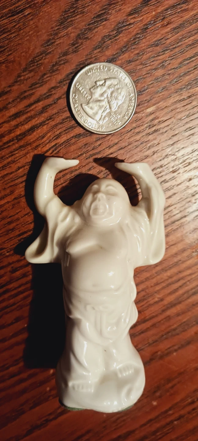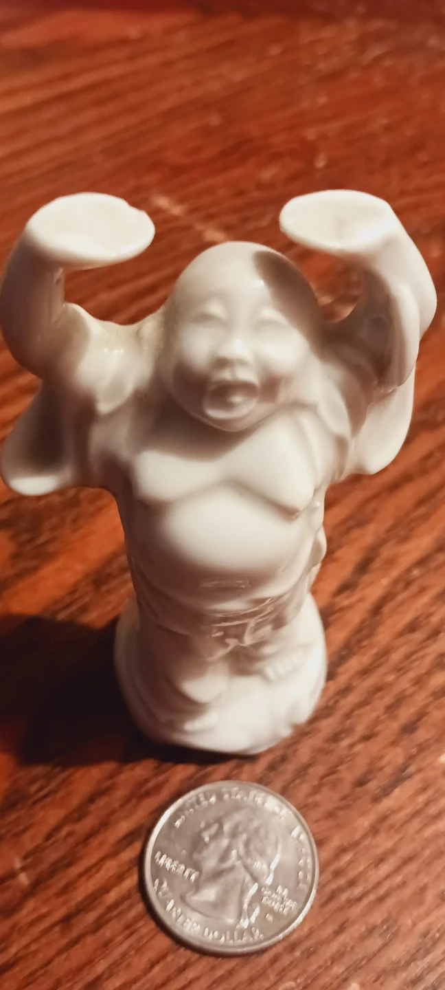 This is a charming white porcelain figurine of a laughing Buddha. It's a cute decorative piece that'll add a touch of joy to any space. 3.5"×2". Excellent condition. ALL MY PRICES ARE NEGOTIABLE !!