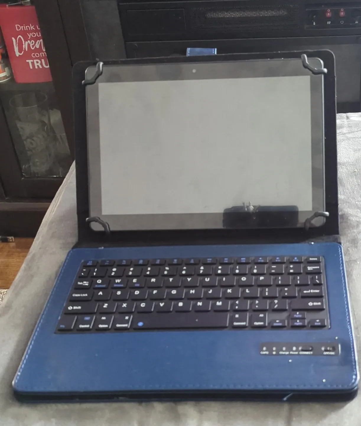 Tablet with a blue synthetic leather keyboard case. It has a standard QWERTY keyboard layout. The case provides a secure fit for the tablet. This setup is useful for typing documents or browsing online.