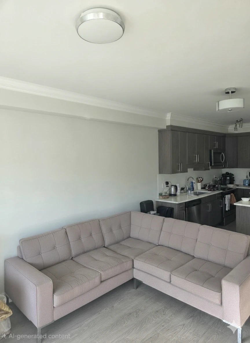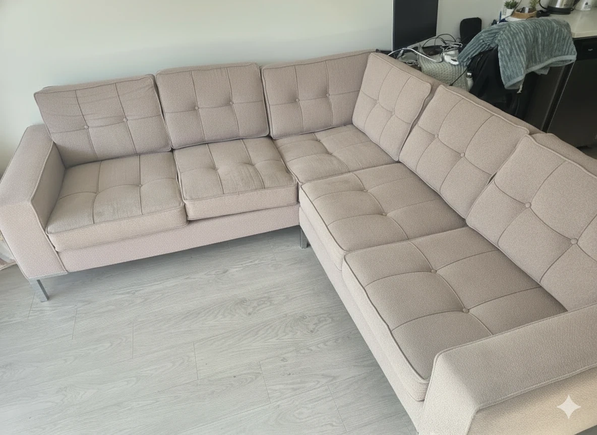 A beige sectional sofa. It has button tufting on the back cushions and seat cushions. The sofa is made of a textured fabric. It's a great piece for a living room or family room.