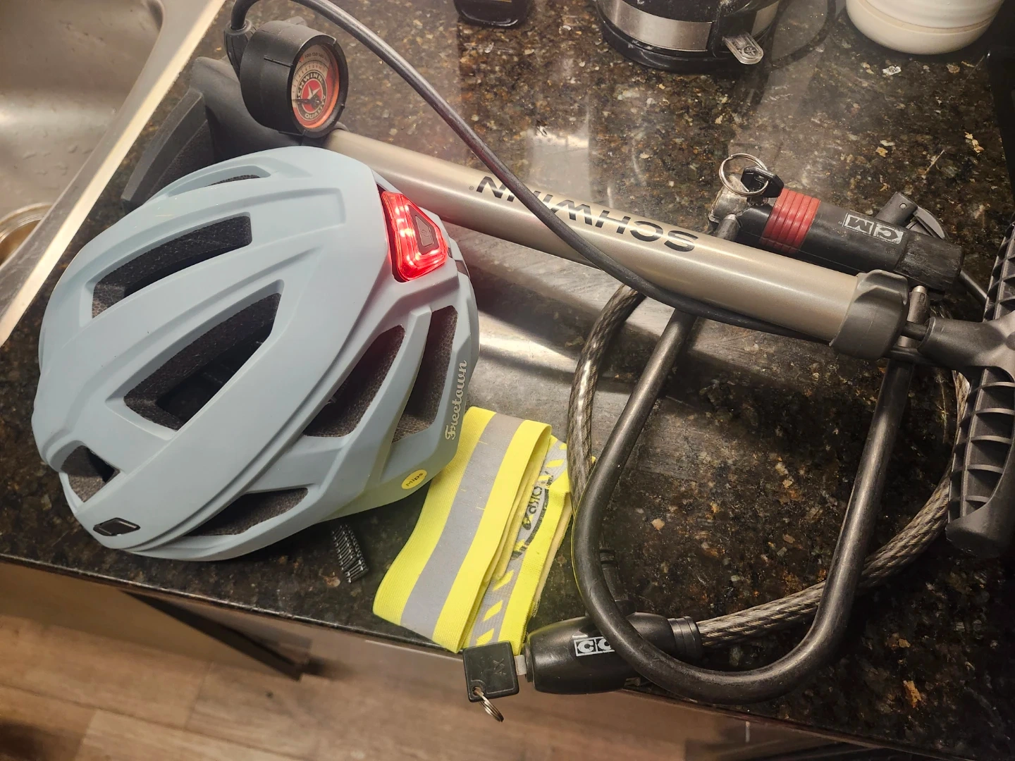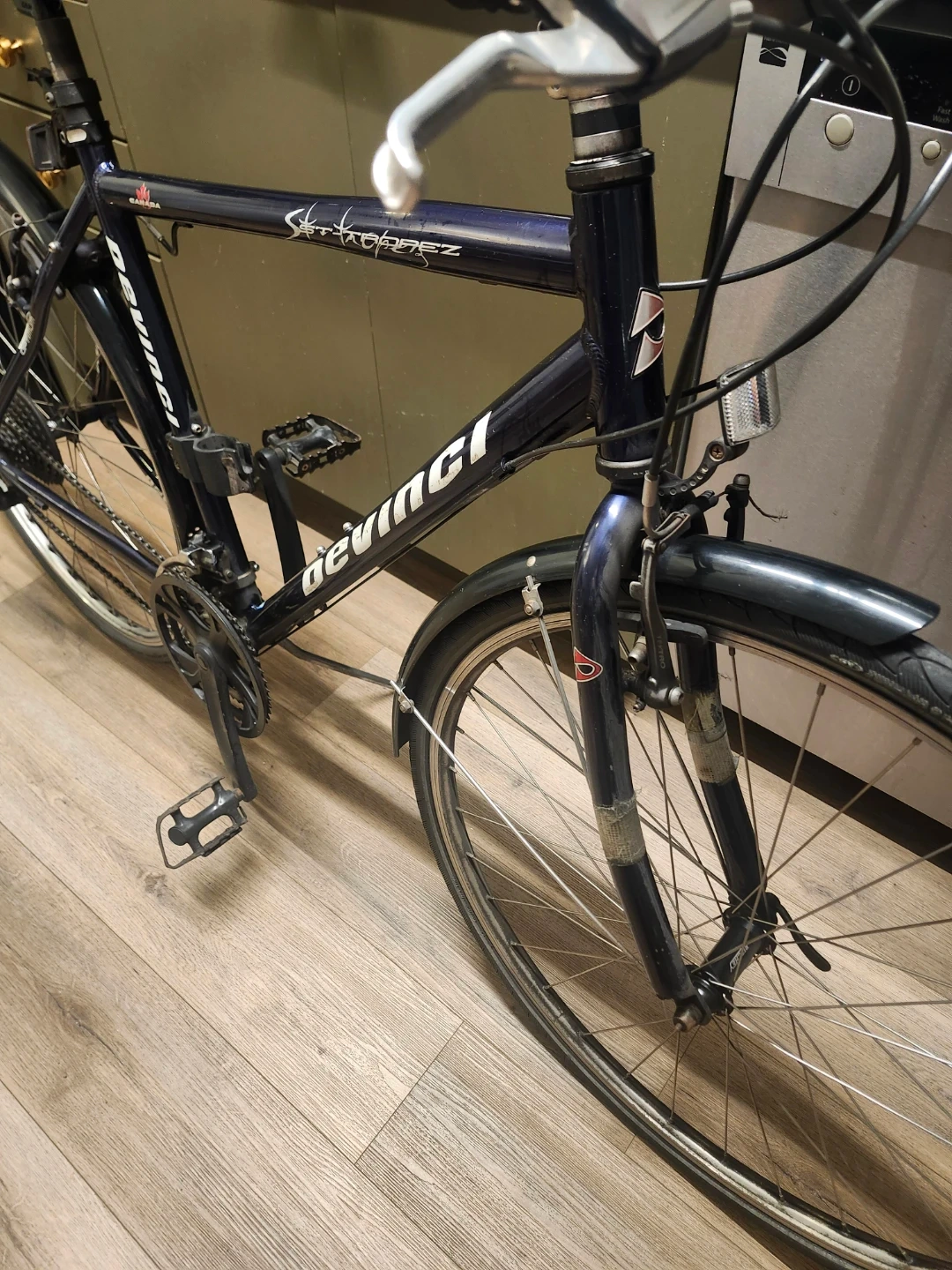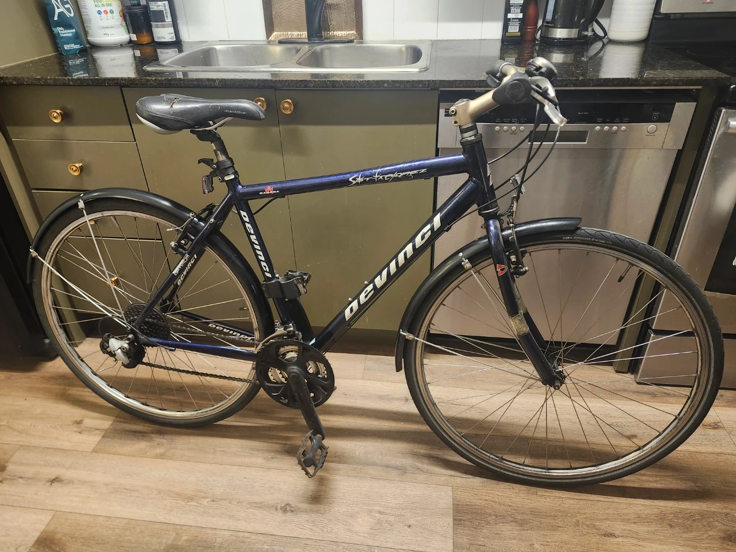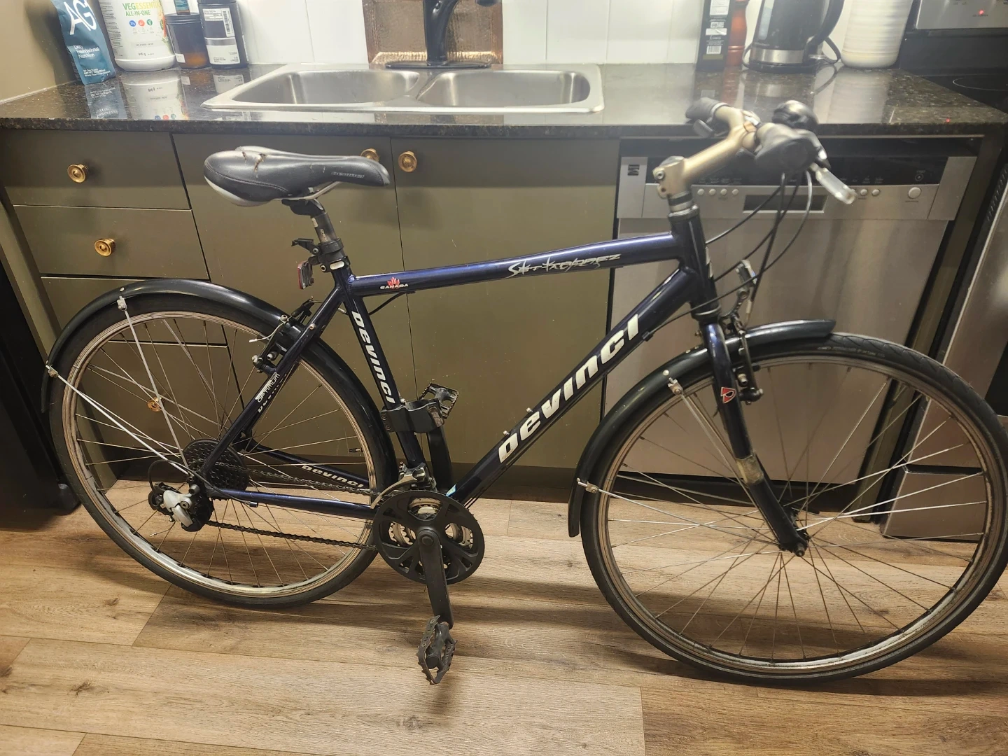 This is a Devinci St. Tropez hybrid bicycle. It is in great condition amd includes extras. Everything works as it should. A solid made in canada hybrid / city commuter bike. Comes with a U lock and a cable lock. Also includes a nice Shwinn bike tire pump, and a brand new helmet with Safety light. Asking 350 obo for everything.