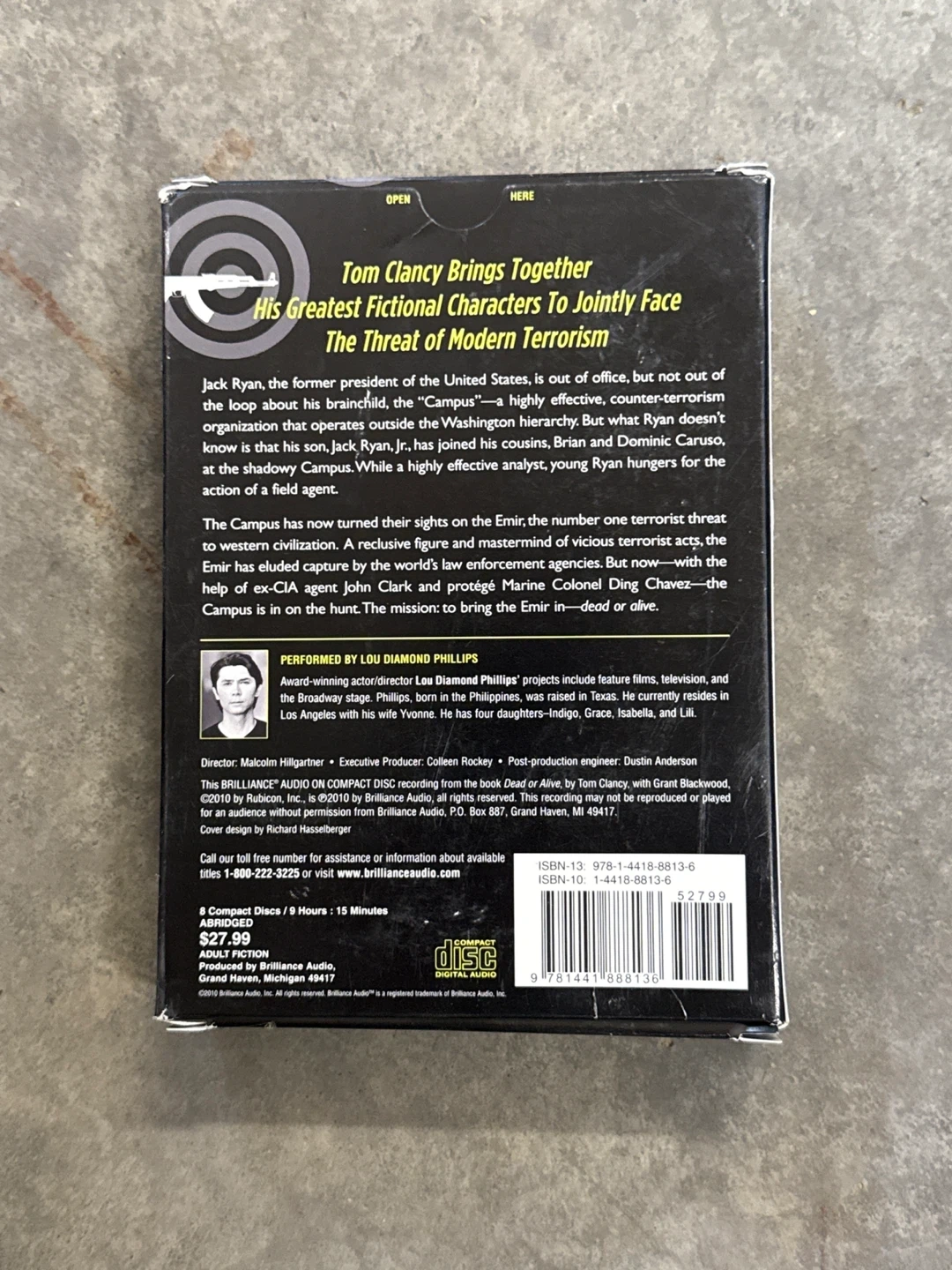 Selling the Tom Clancy Dead or Alive audiobook on compact disc. It's a #1 New York Times Bestselling Author book. The audiobook is performed by Lou Diamond Phillips. It runs for 9 hours and 15 minutes.