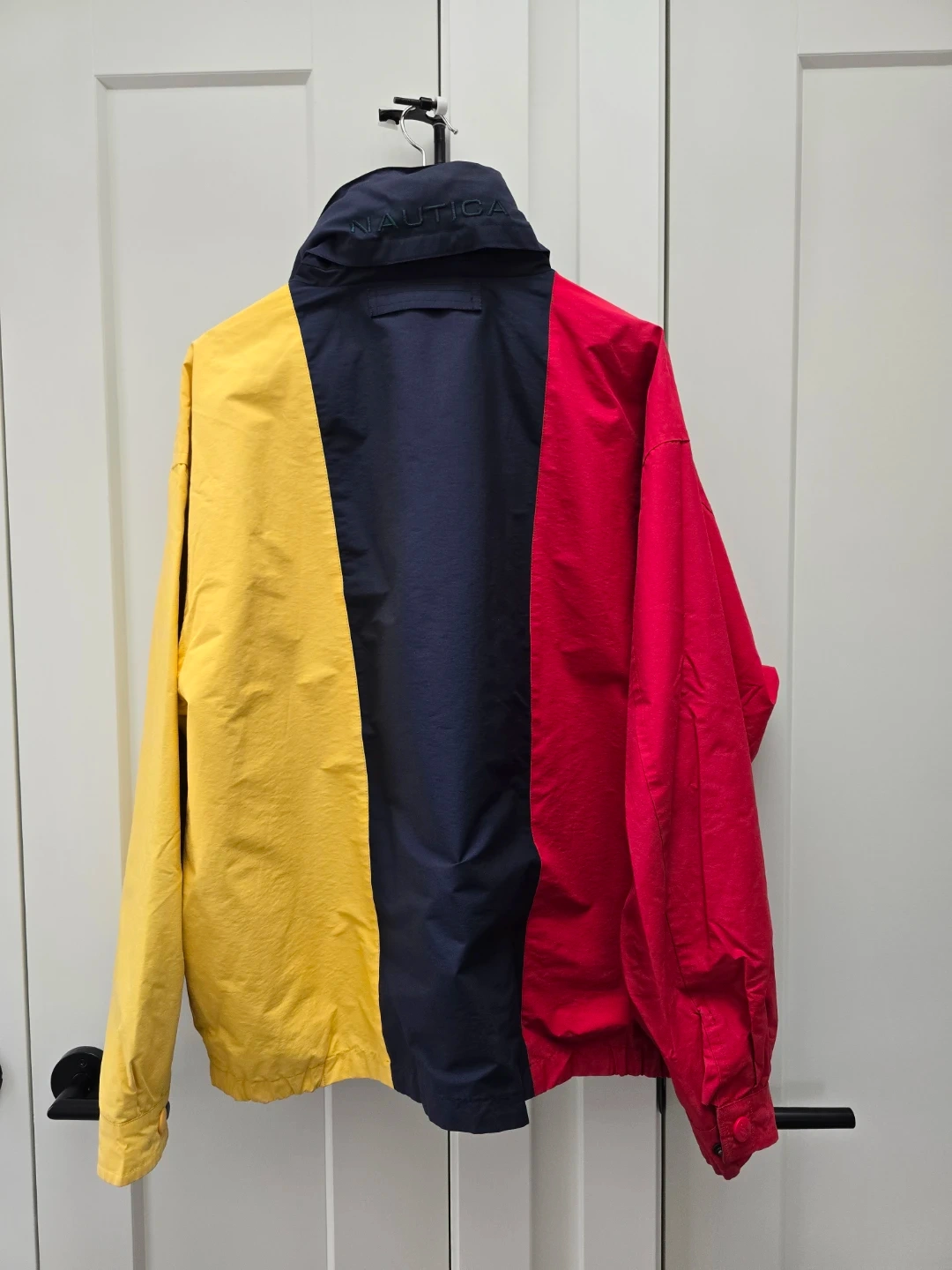 This Nautica jacket features a bold colour block design with red, navy, and yellow panels. It's a classic windbreaker style. It would be great for cooler spring or fall days!