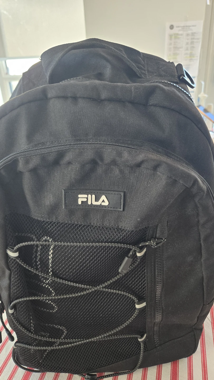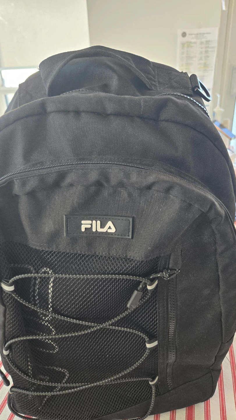 This is a black Fila backpack. It's made of durable fabric and has multiple zippered compartments. It also features adjustable padded shoulder straps for comfort. It's a great bag for school or everyday use!