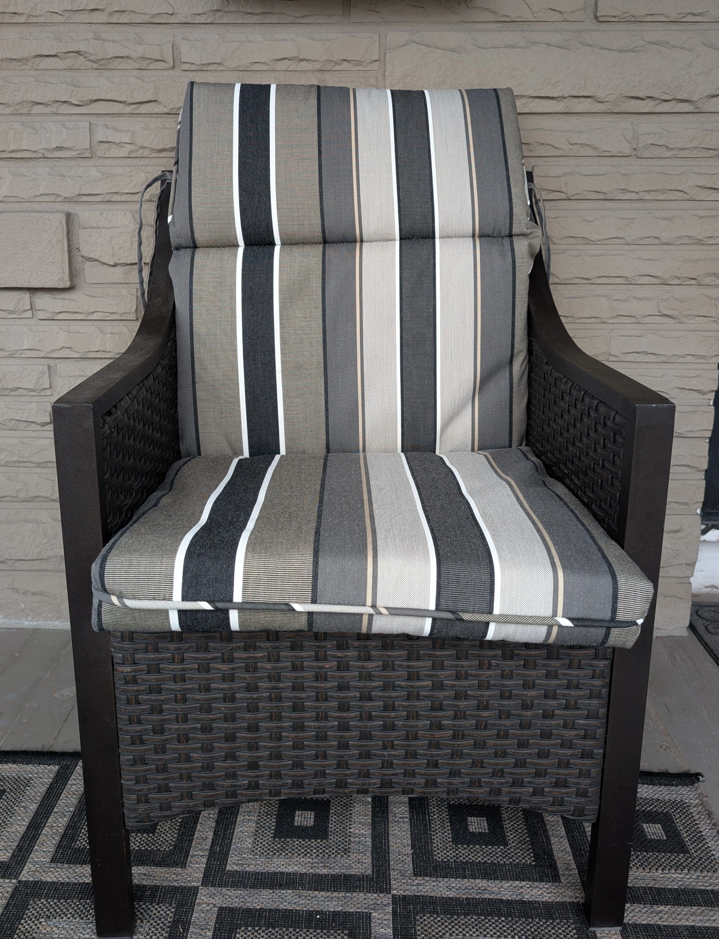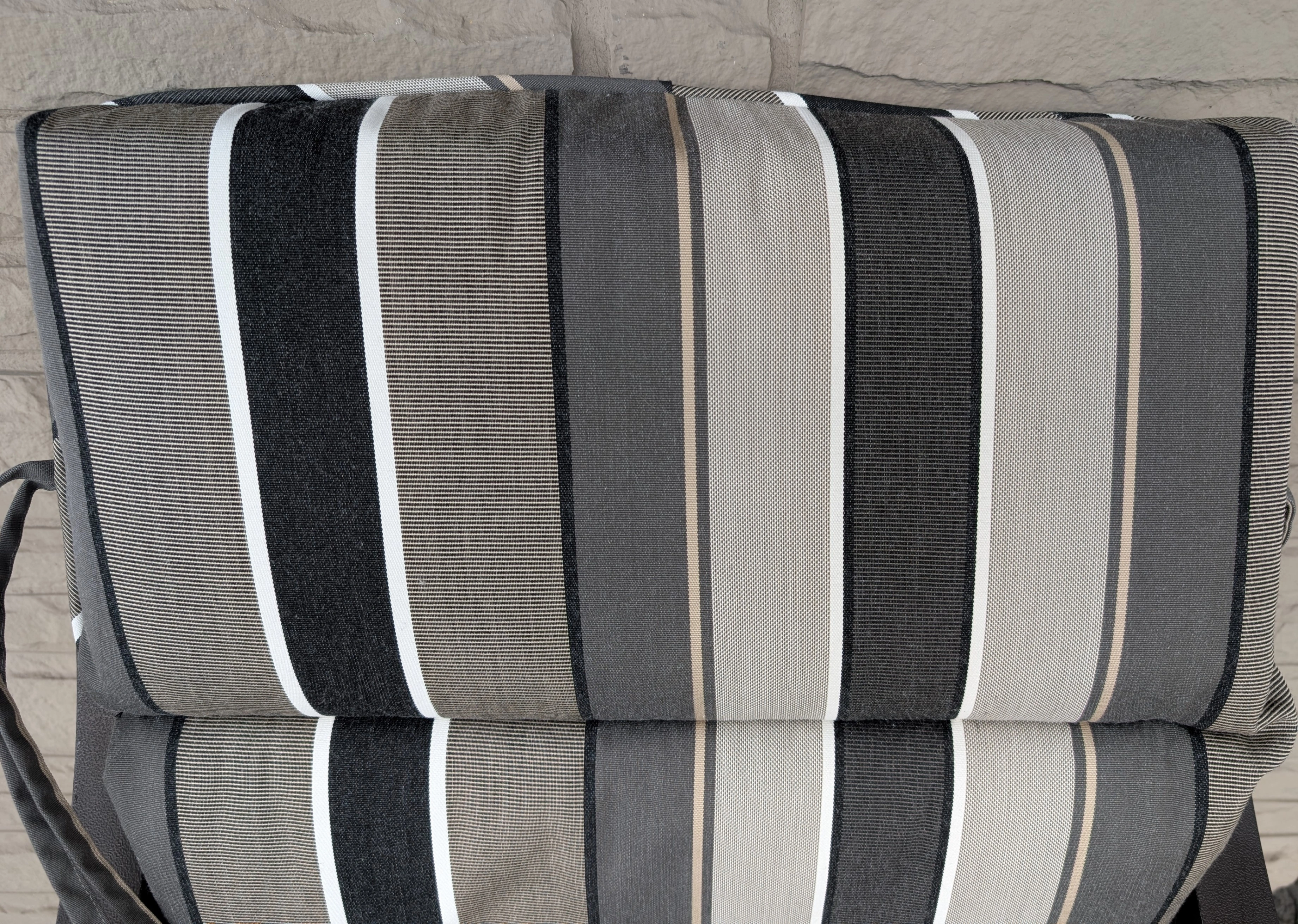 A high-quality cushion for a patio chair. Weather resistant, with ties at the top and sides. Shades of dark and light grey and black, with piped trimming. 3" thick cushion is comfortable. Porch pick-up. Runnymede-Bloor area.