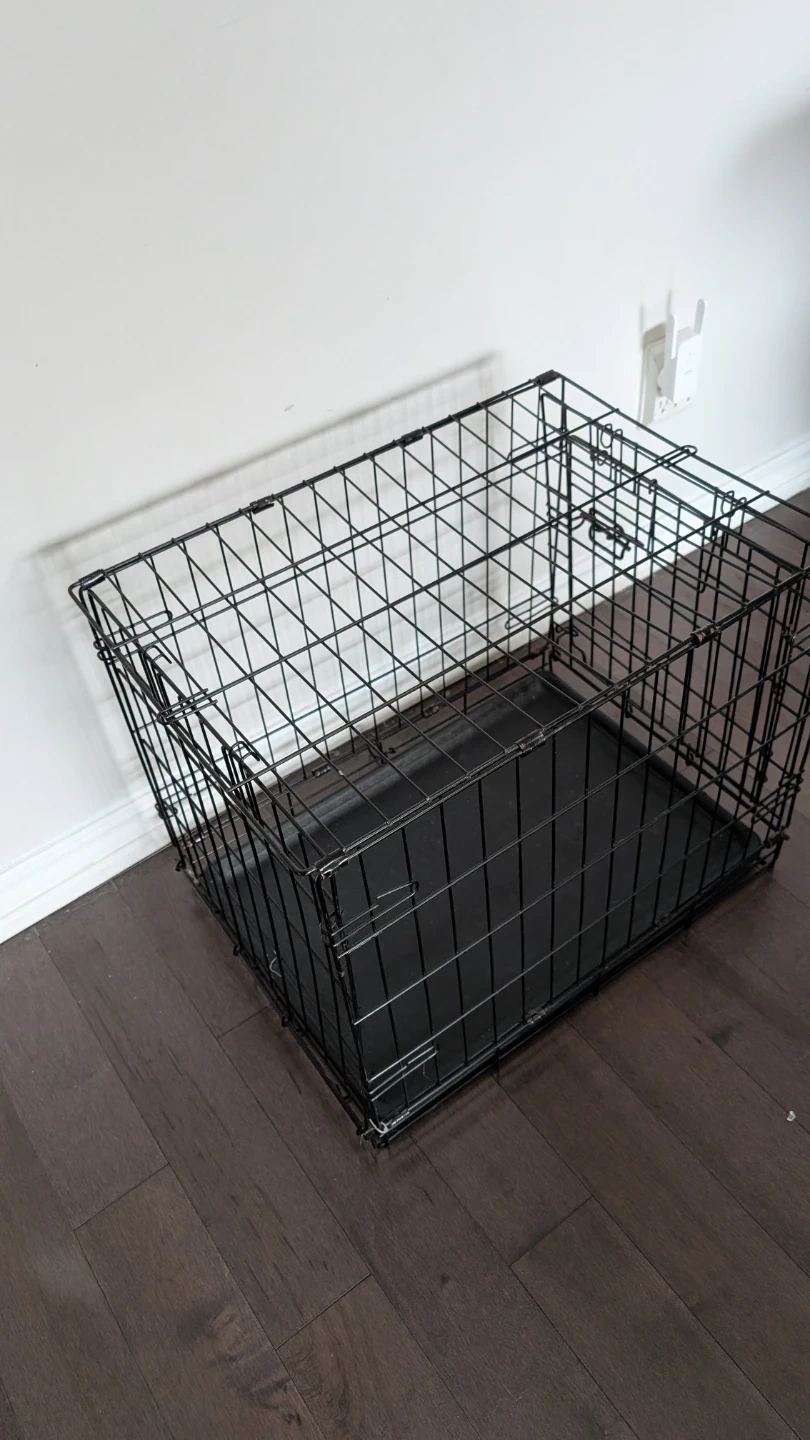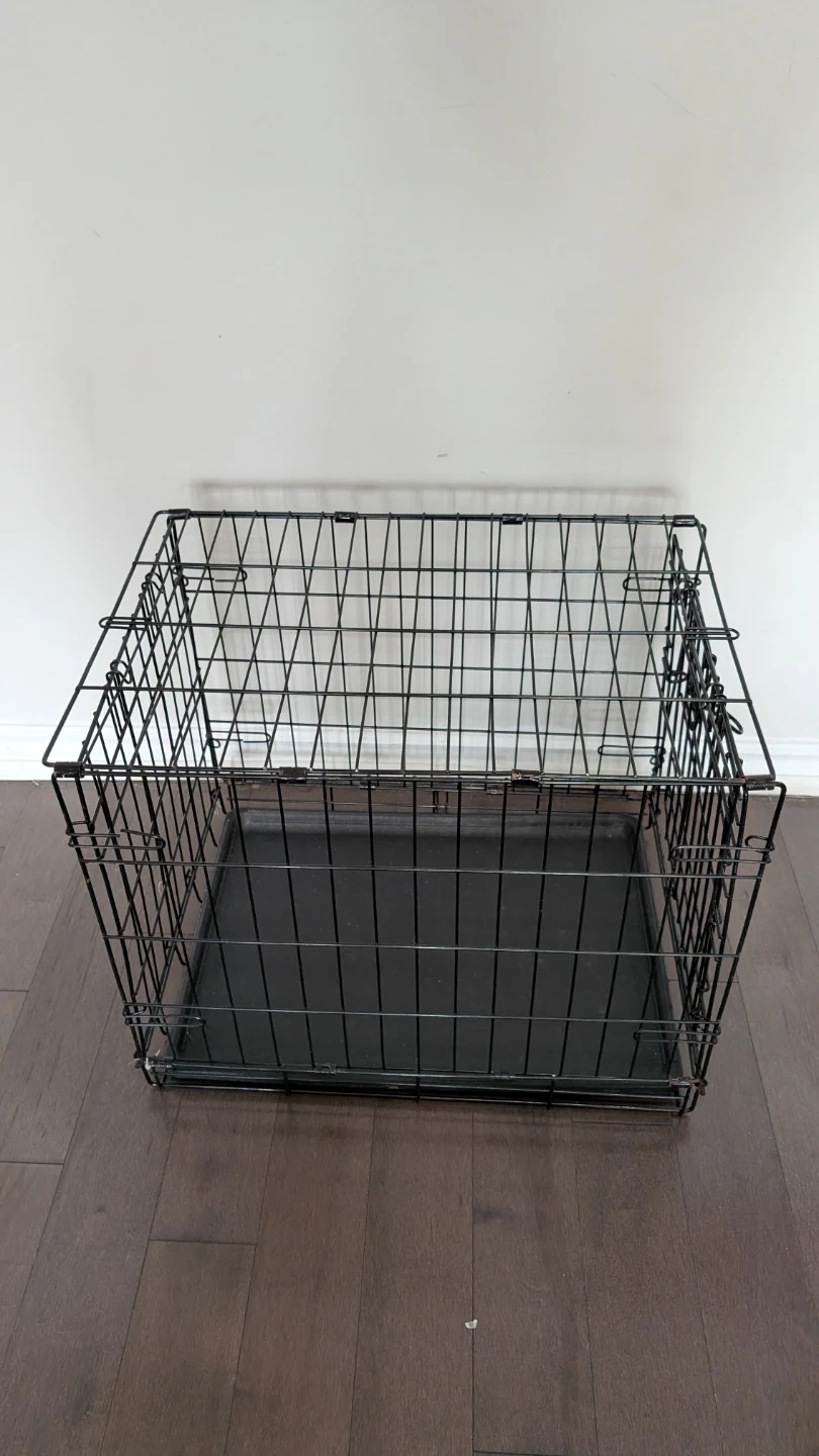 This is a wire pet(dog/cat) crate / Cage with a removable black plastic tray. It's suitable for small to medium-sized dogs. The crate folds flat for storage. It's a handy item for training or travel!