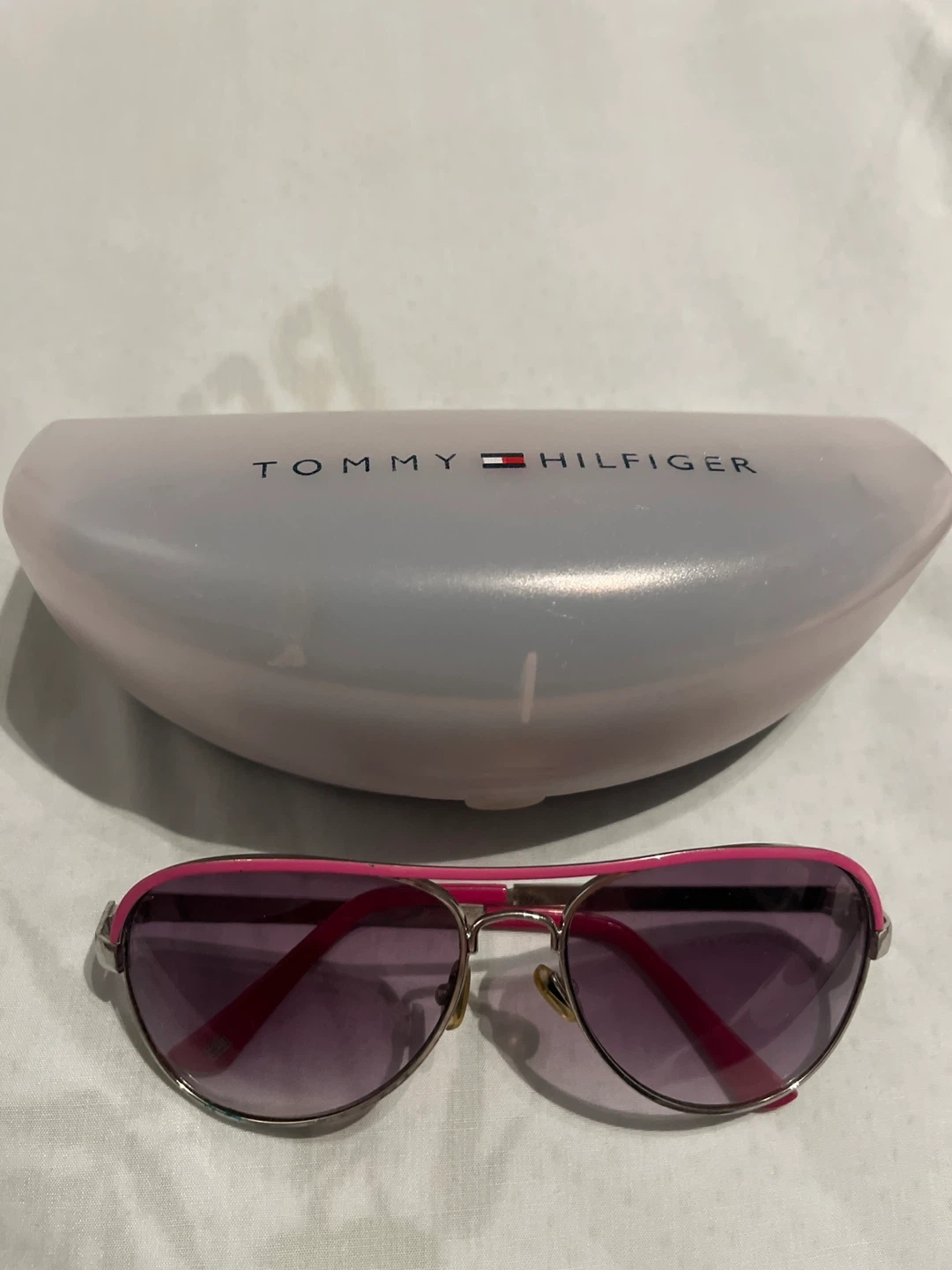 Selling a pair of Tommy Hilfiger sunglasses! They come with the original case. The frames are a fun pink colour.