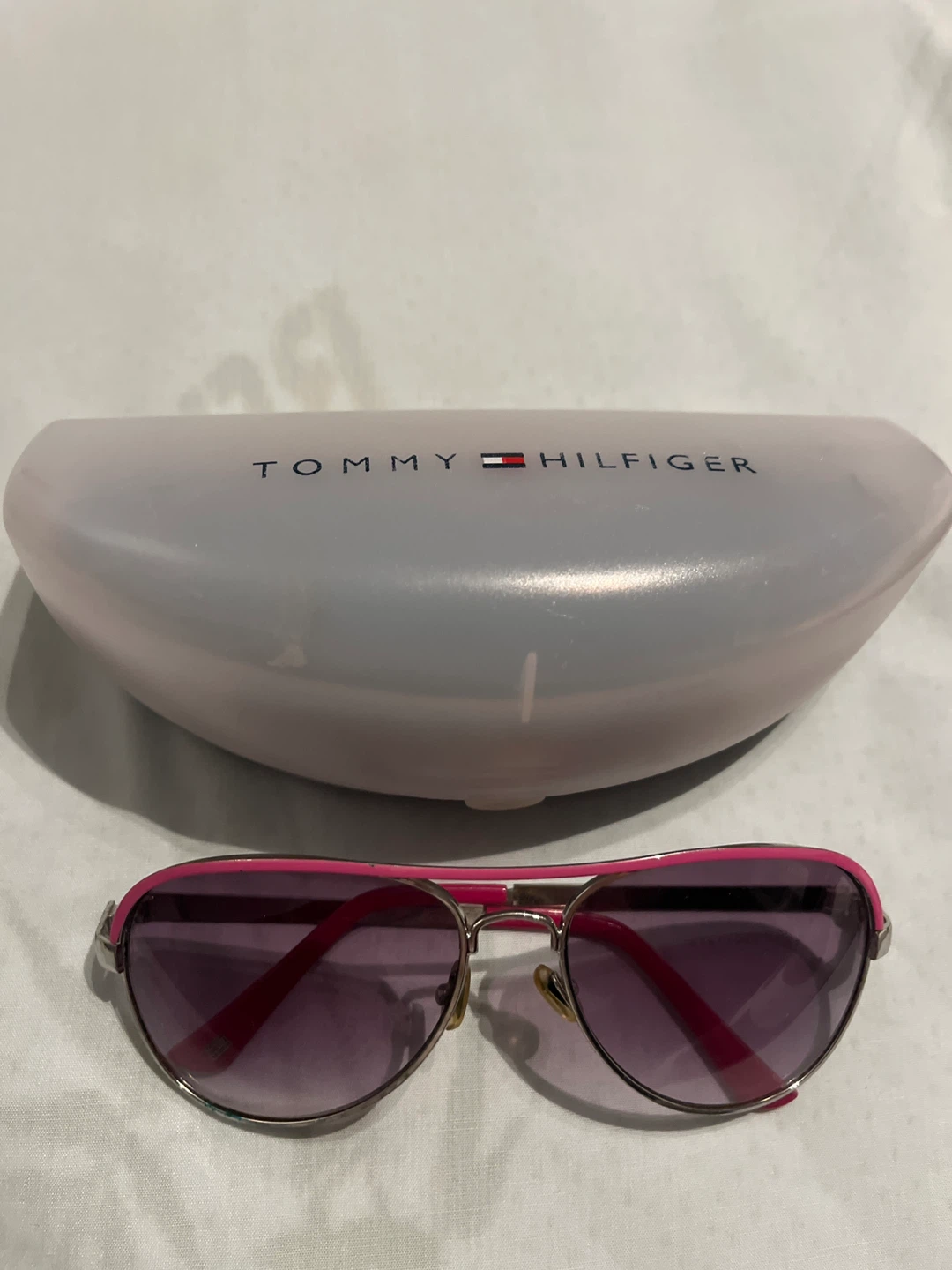 Selling a pair of Tommy Hilfiger sunglasses! They come with the original case. The frames are a fun pink colour.
