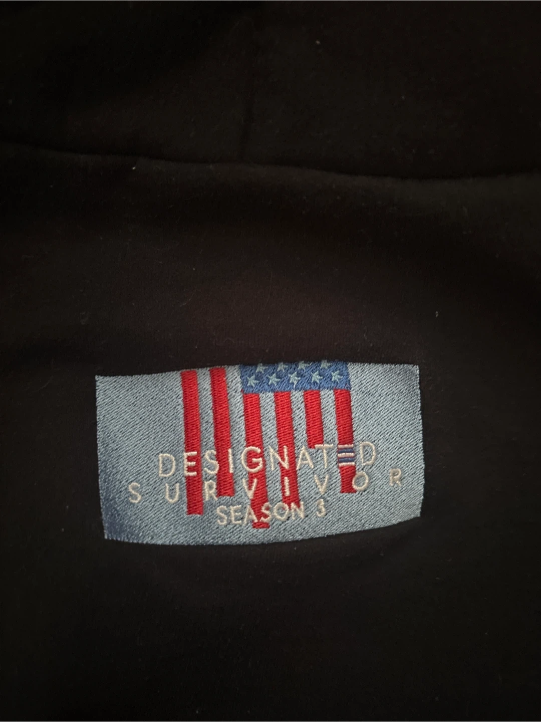 Black Champion hoodie with a Designated Survivor Season 3 patch on the front. It's a comfy pullover with a hood and front pocket. Great for fans of the show! Fits like a unisex medium
