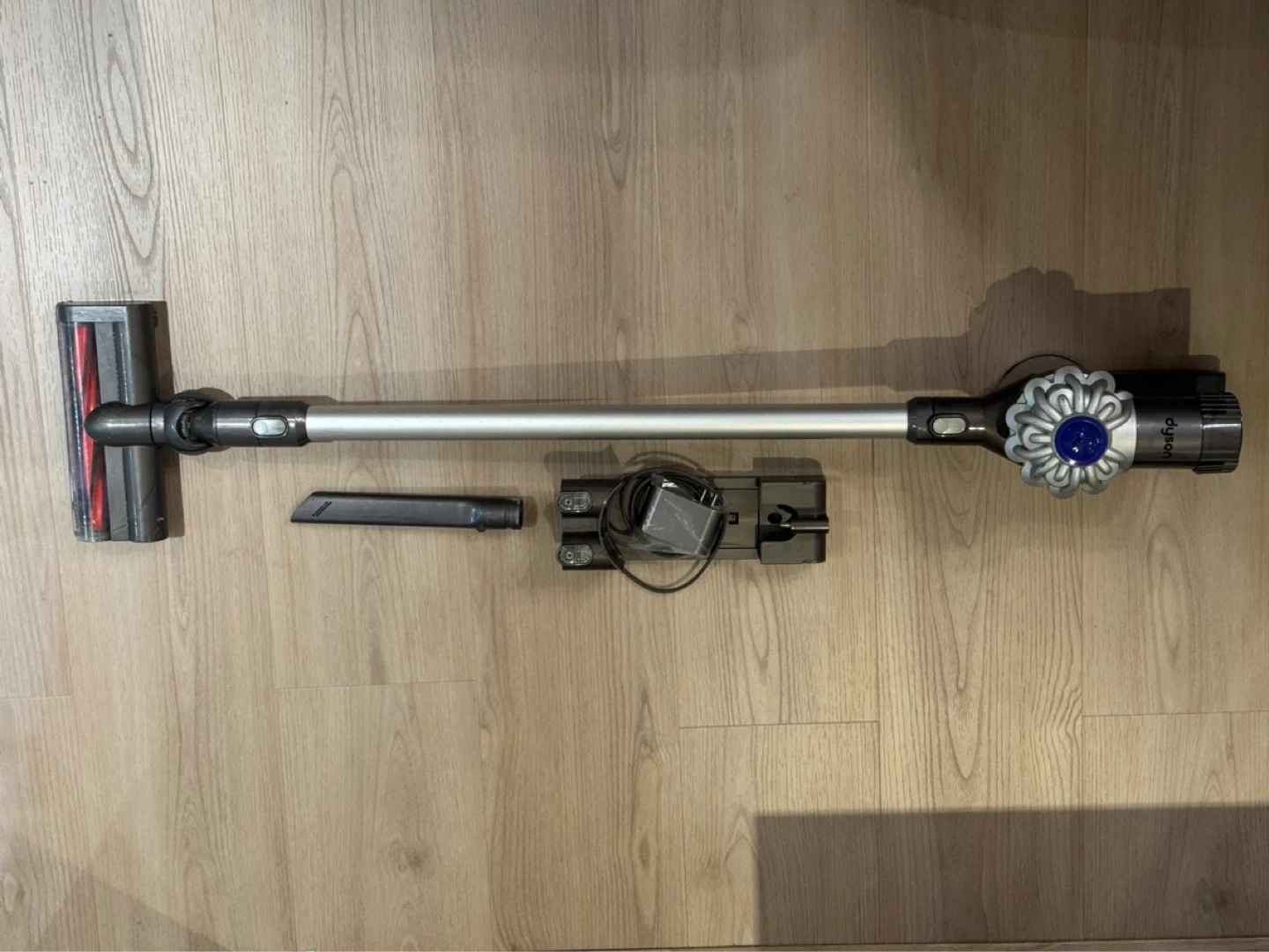 Dyson cordless vacuum cleaner with main unit, charger, wall mount, and crevice tool. It's a grey and silver model. Great for quick cleanups!