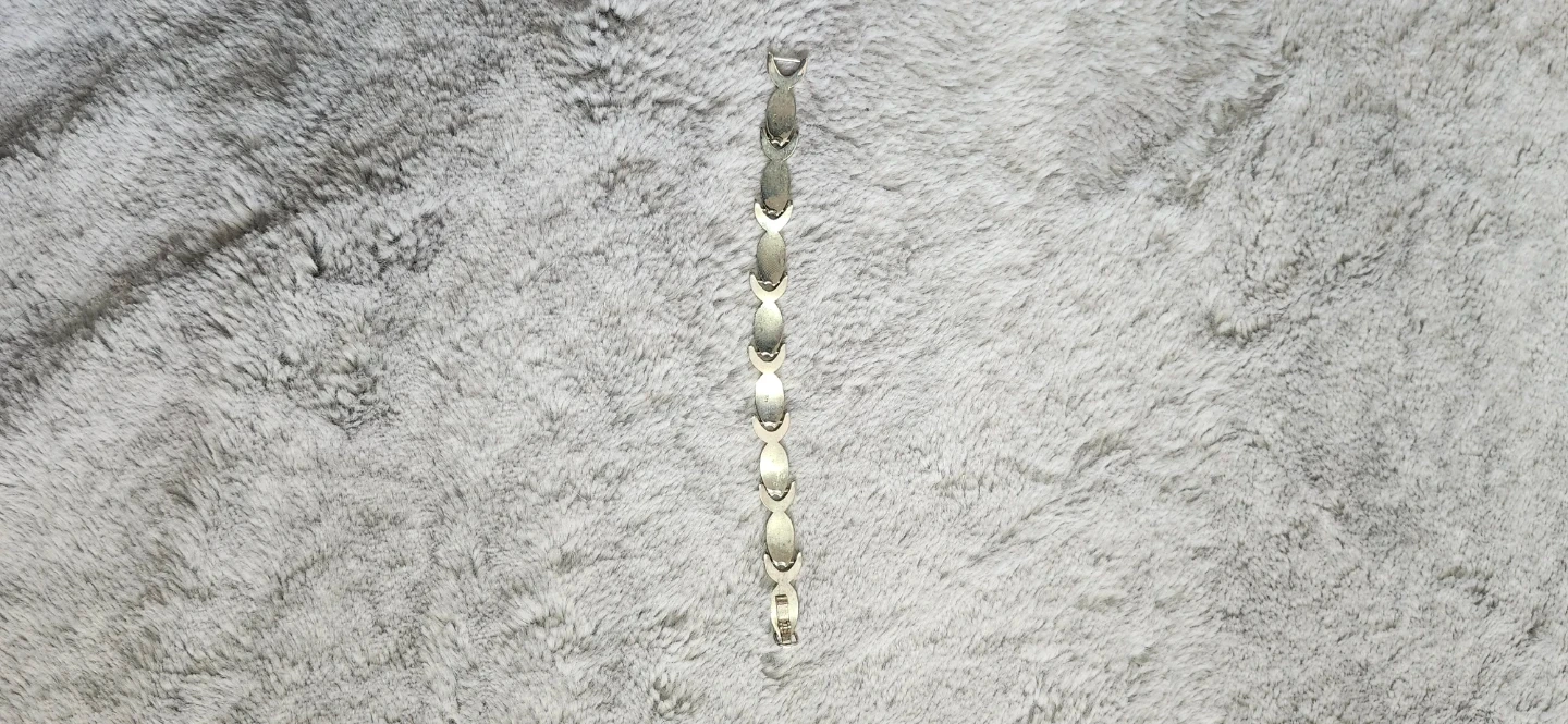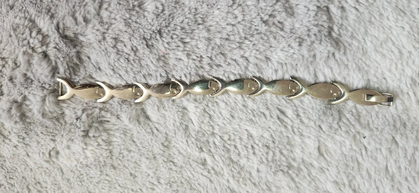 A cute silver-tone bracelet with a repeating fish link design. It's got a clasp closure. STAMPED 9.25. This piece is great for adding a touch of whimsy to any outfit!