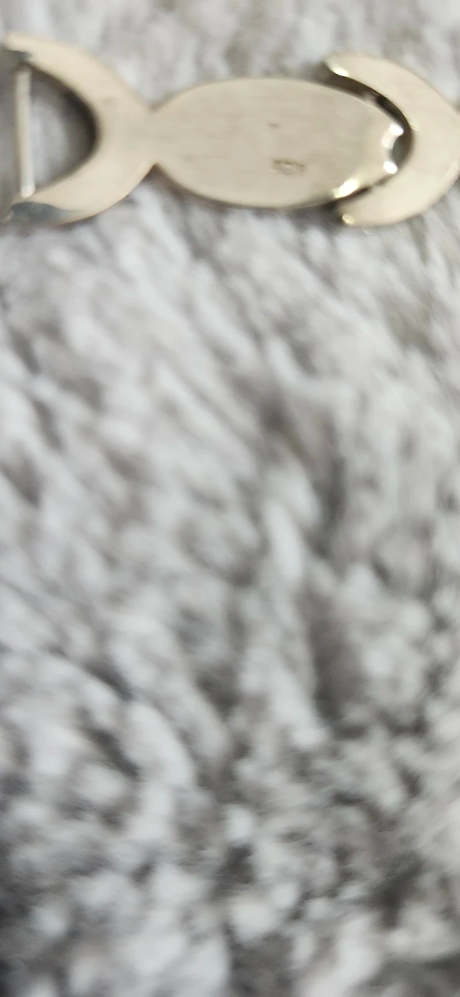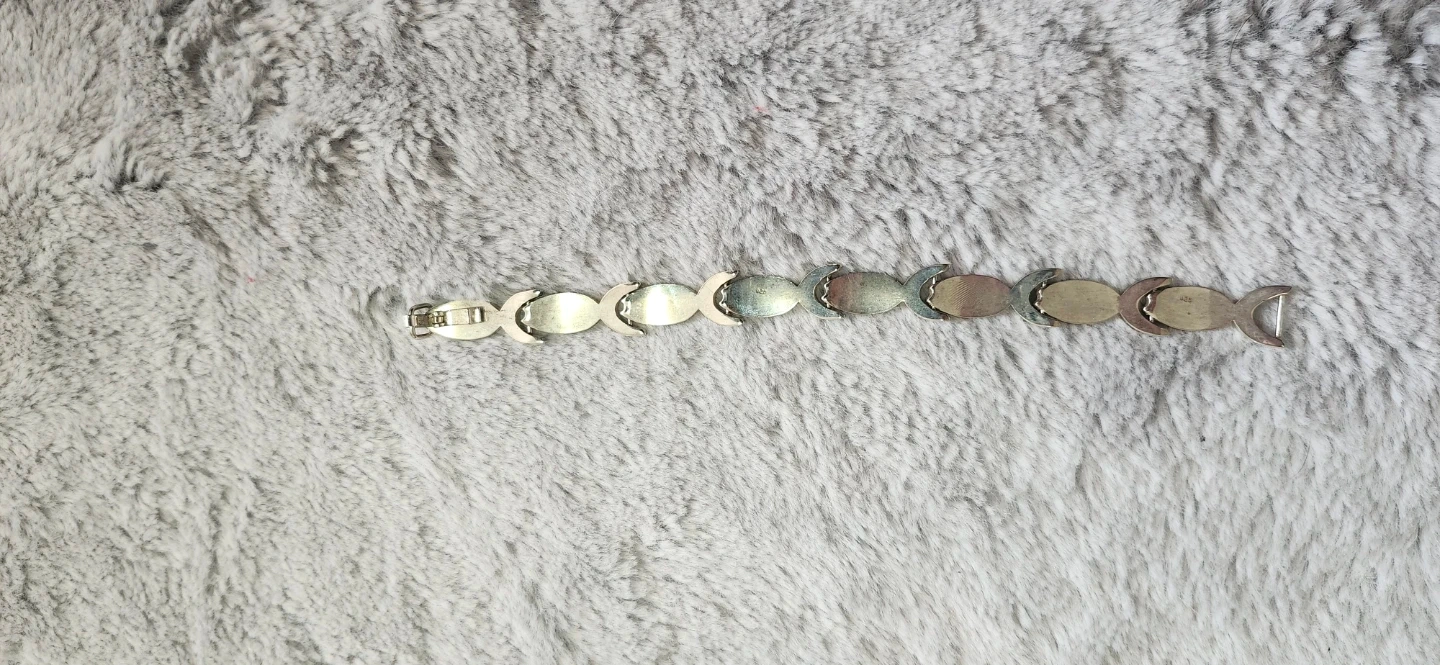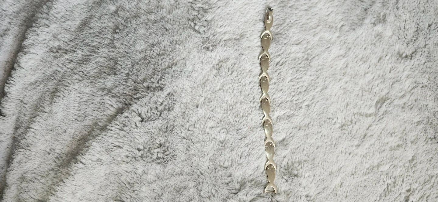 A cute silver-tone bracelet with a repeating fish link design. It's got a clasp closure. STAMPED 9.25. This piece is great for adding a touch of whimsy to any outfit!
