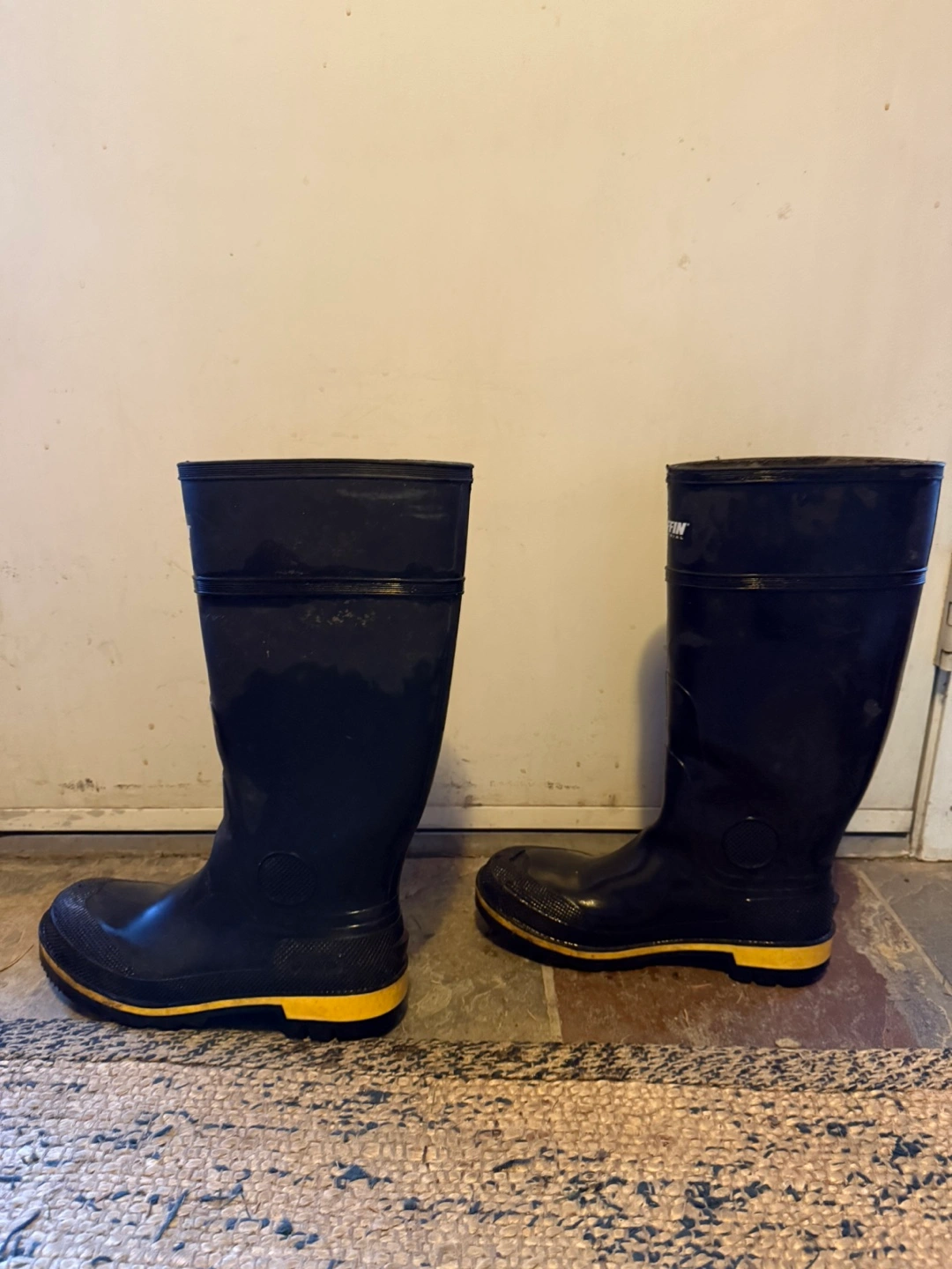Pair of black rubber boots. Yellow accents on the sole. Protective footwear. Good for various outdoor work.