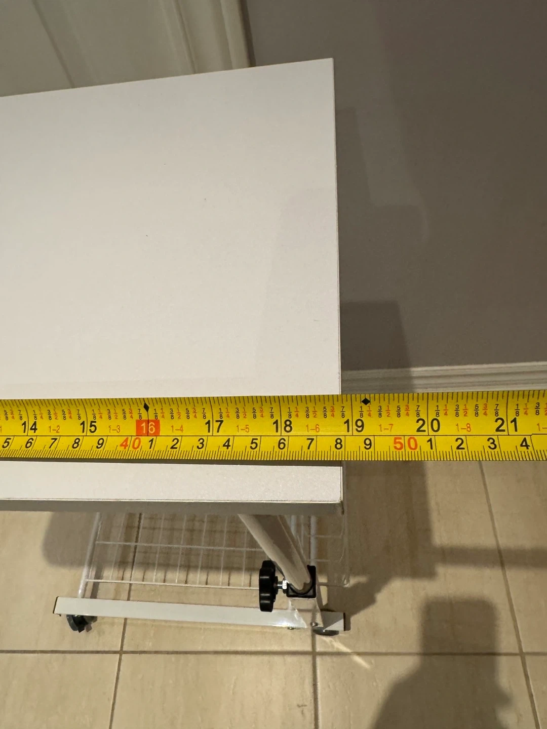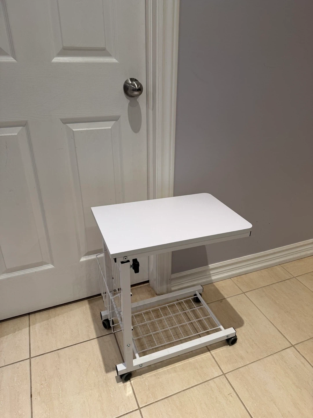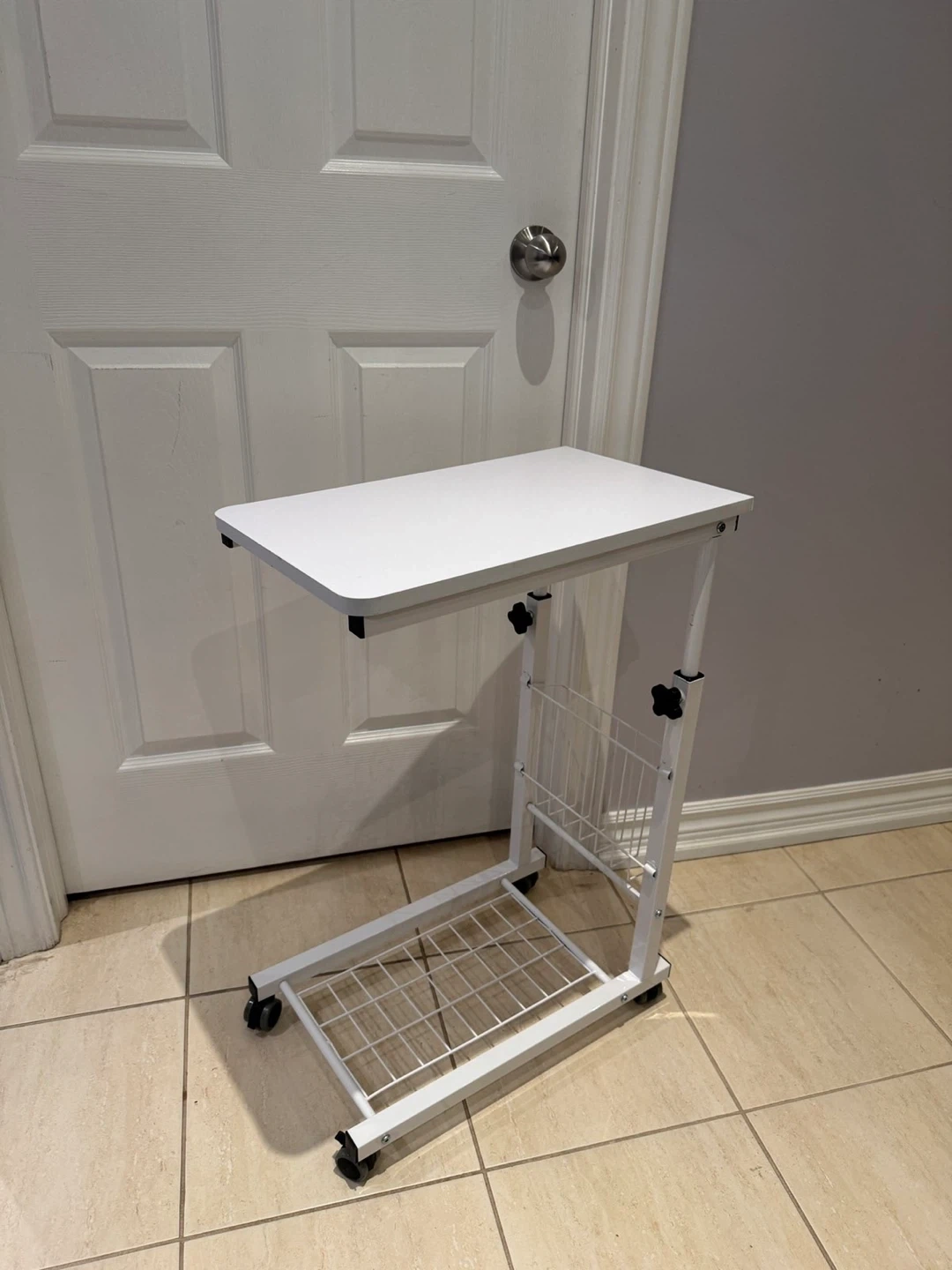 This white rolling table features an adjustable height and a handy lower shelf. It's great for use next to a bed or couch. The metal frame includes a wire rack for extra storage.
