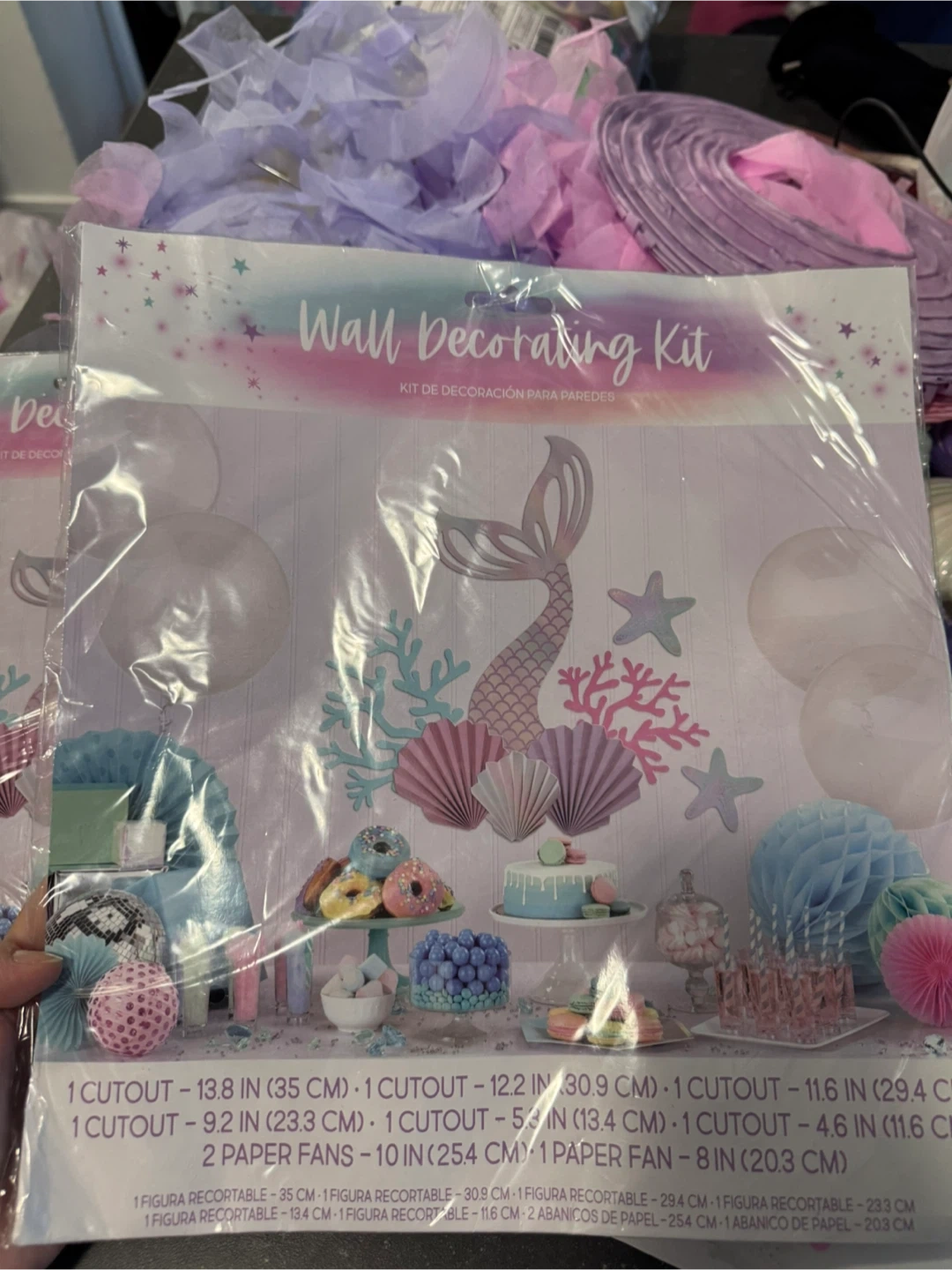 This kit has wall decorating elements for a mermaid theme. It includes various cutouts, paper fans, and shells decoration . Great for a birthday party!