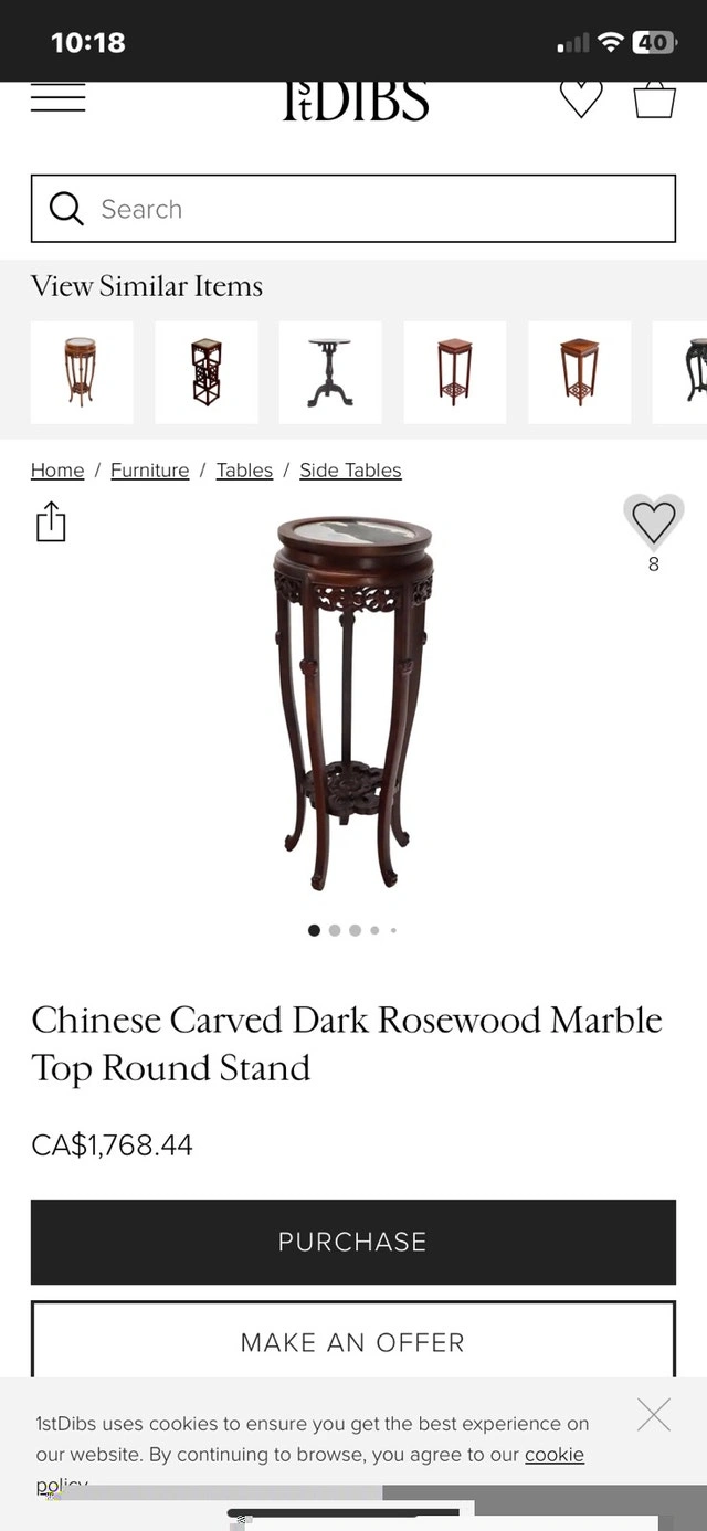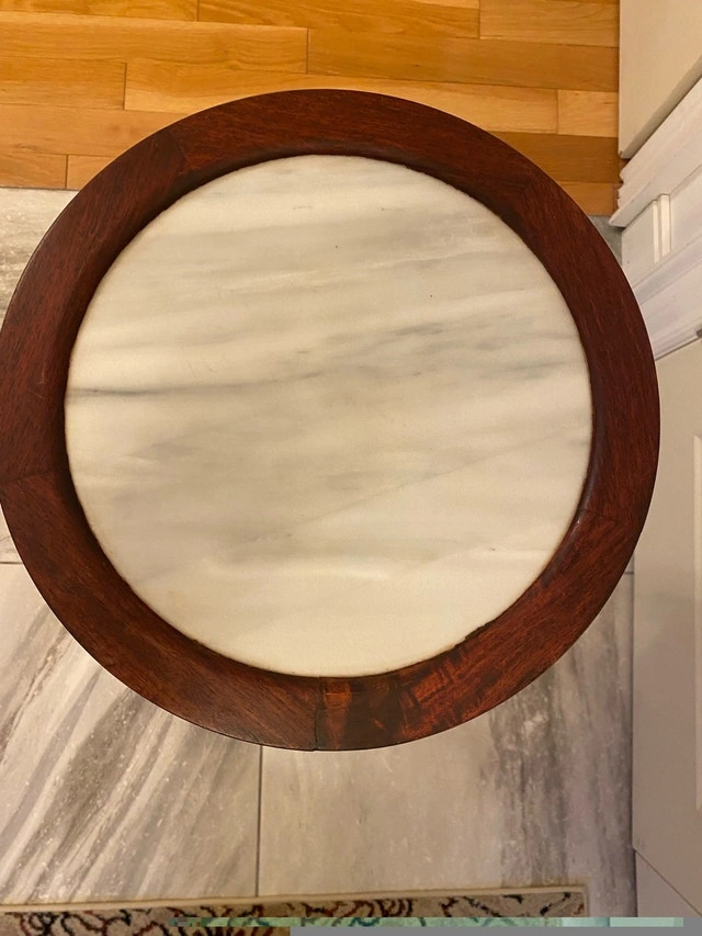 Vintage, antique hand-carved red wood hall console table with a beautiful Chinese marble top. It stands 32 inches tall and has a diameter of 13 inches. Condition is used, like new. Cash accepted.