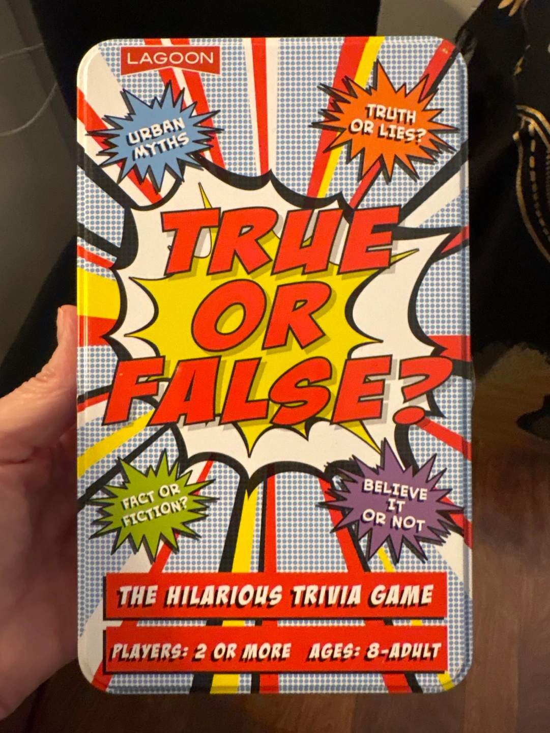 Fun trivia game for 2 or more players, ages 8 and up. Comes in a tin. Features urban myths, fact or fiction, truth or lies, and believe it or not questions.brand new sealed.