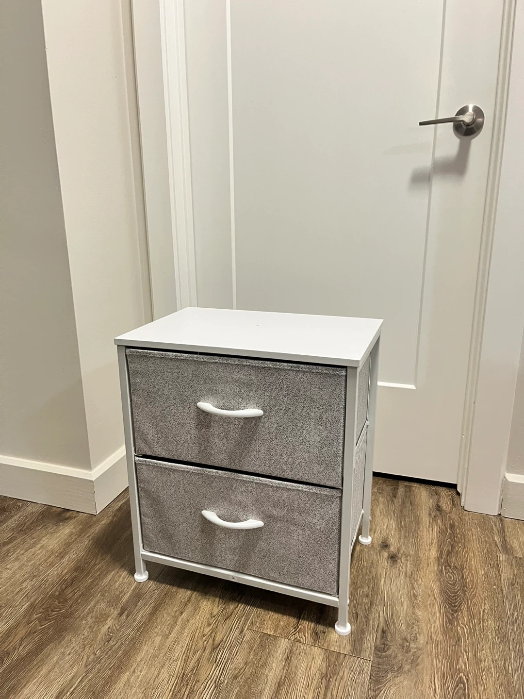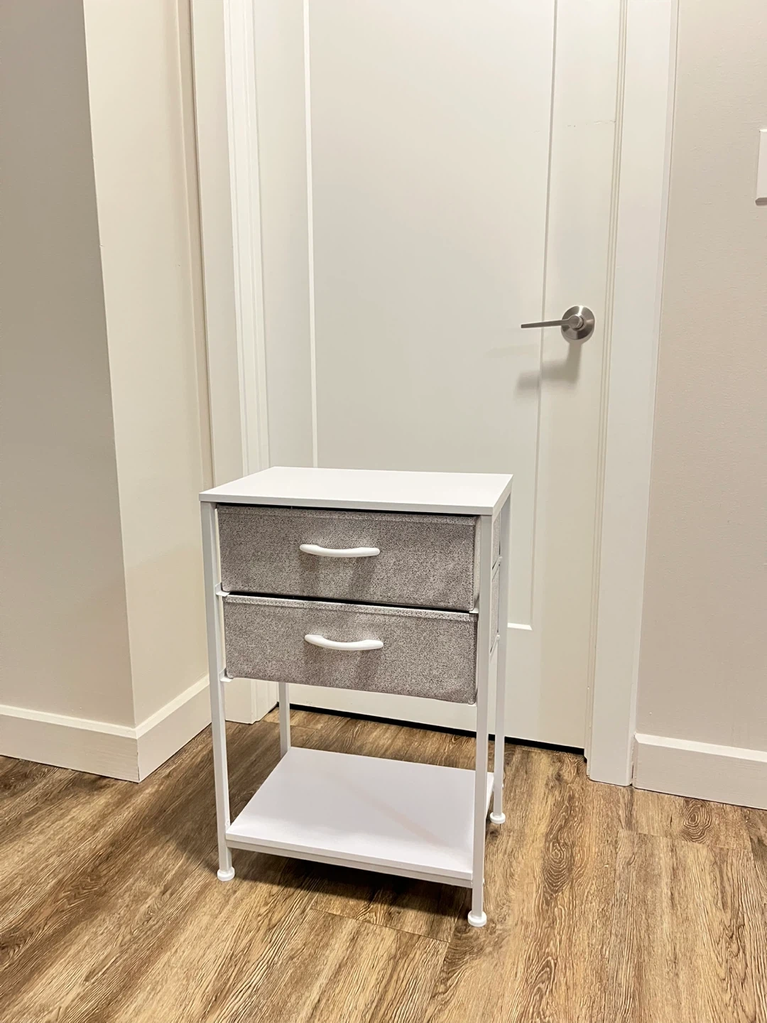This compact dresser is great for small spaces! It features two fabric drawers with easy-pull handles and a sturdy white top. The metal frame ensures durability for everyday use.