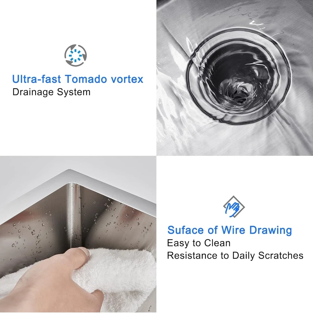 It measures 28 inches wide, 16 inches deep, and 8.5 inches high. It's made of SUS304 grade stainless steel, making it super sturdy and extremely durable. The sink features R10 coved corners, making it look great and easy to clean. It also has an ultra-fast tornado vortex drainage system and a surface of wire drawing for easy cleaning and resistance to daily scratches