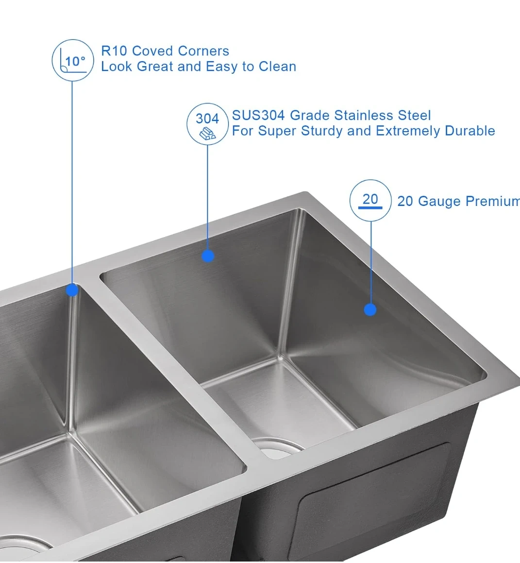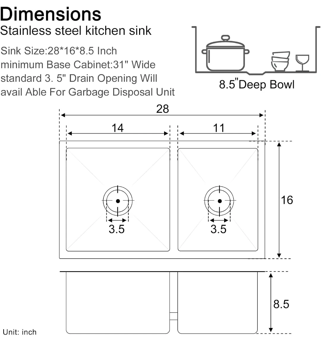 It measures 28 inches wide, 16 inches deep, and 8.5 inches high. It's made of SUS304 grade stainless steel, making it super sturdy and extremely durable. The sink features R10 coved corners, making it look great and easy to clean. It also has an ultra-fast tornado vortex drainage system and a surface of wire drawing for easy cleaning and resistance to daily scratches