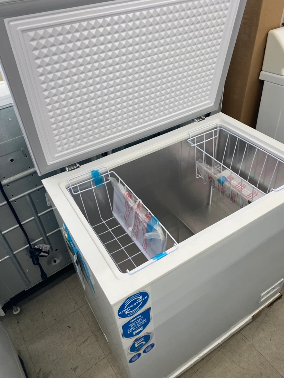 NEW Danby 7 ft.³ Chest Freezer/Fridge, measure 33” x 22”, 34” high. Includes two baskets, aluminum lined interior and floor drain with five year factory warranty. Delivery available. $345. 204.663.9988.