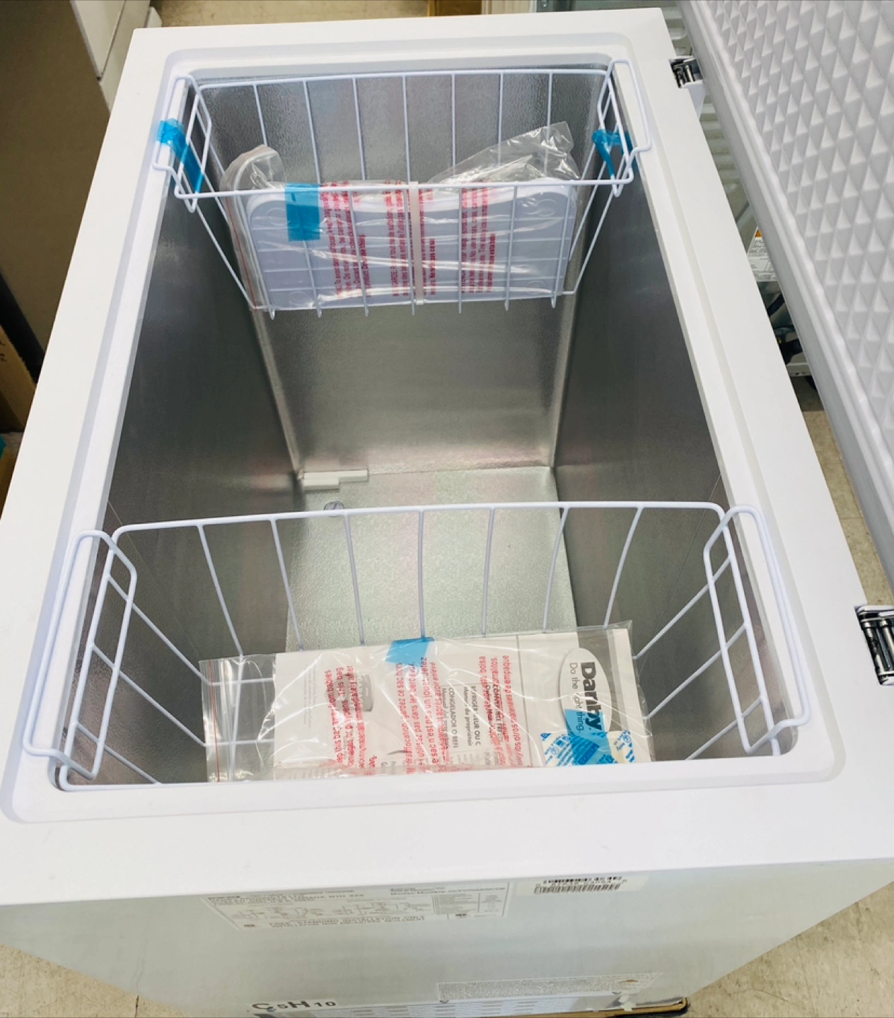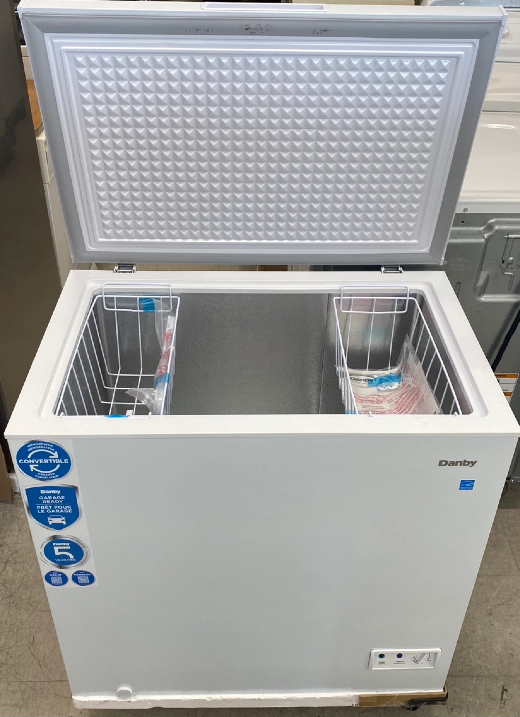 NEW Danby 7 ft.³ Chest Freezer/Fridge, measure 33” x 22”, 34” high. Includes two baskets, aluminum lined interior and floor drain with five year factory warranty. Delivery available. $345. 204.663.9988.