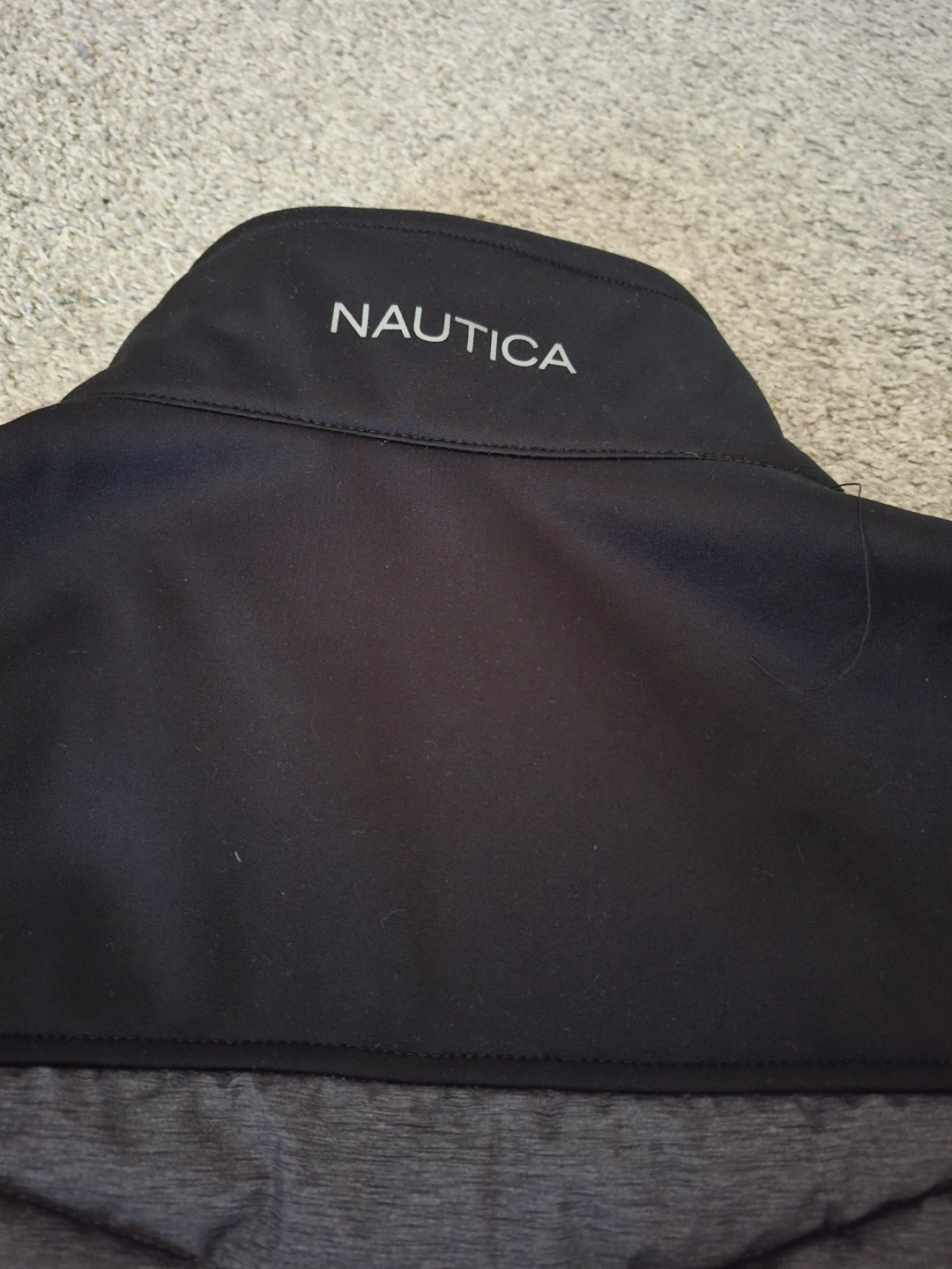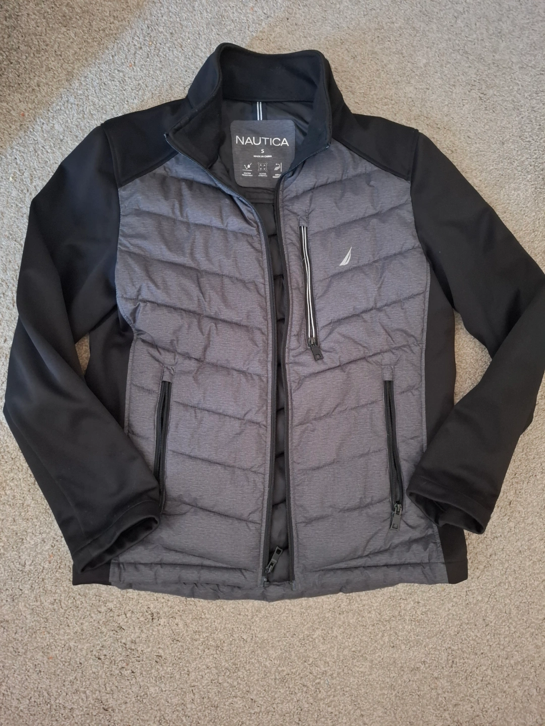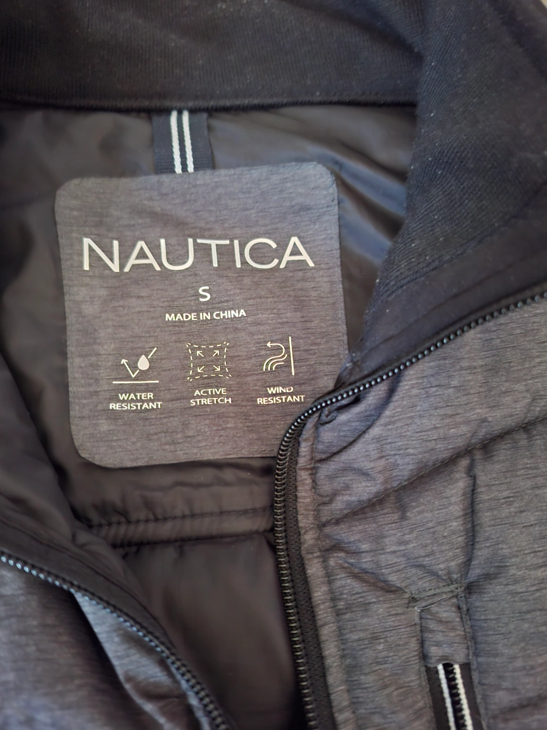 Men's Nautica jacket, size small. Grey and black. Water resistant, wind resistant, and active stretch. Features a zipper closure and pockets.