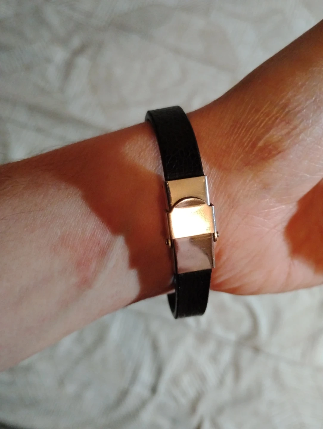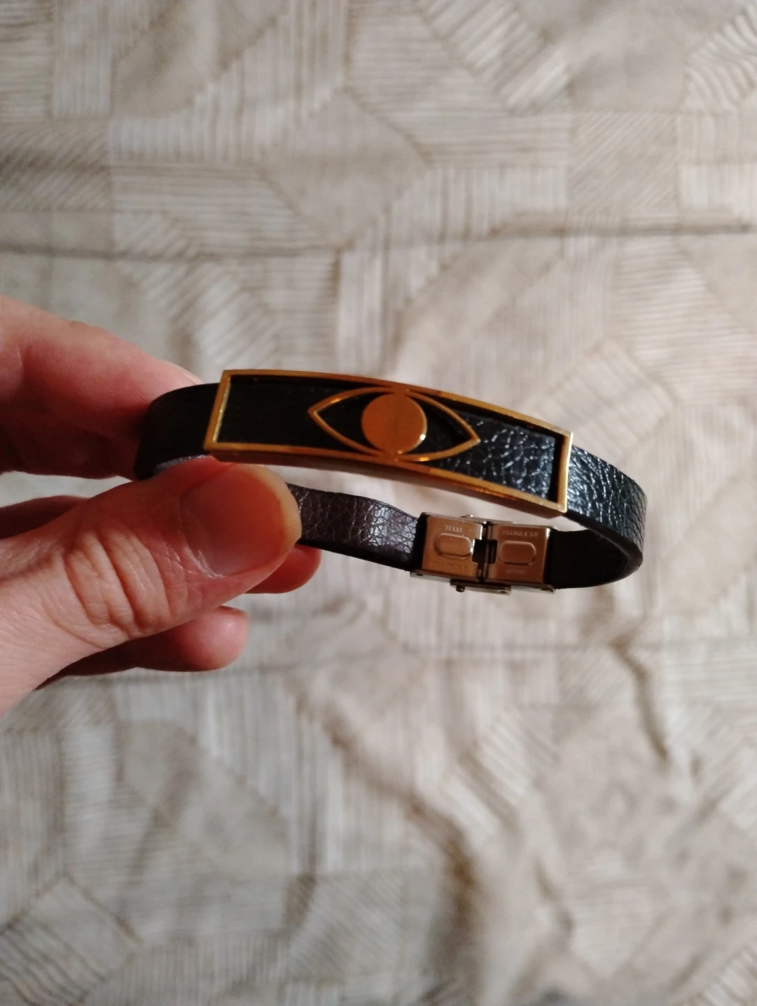 Cool black leather bracelet with a gold-toned metal accent featuring an eye design. It's got a secure clasp for easy wear. This bracelet adds a unique touch to any outfit!