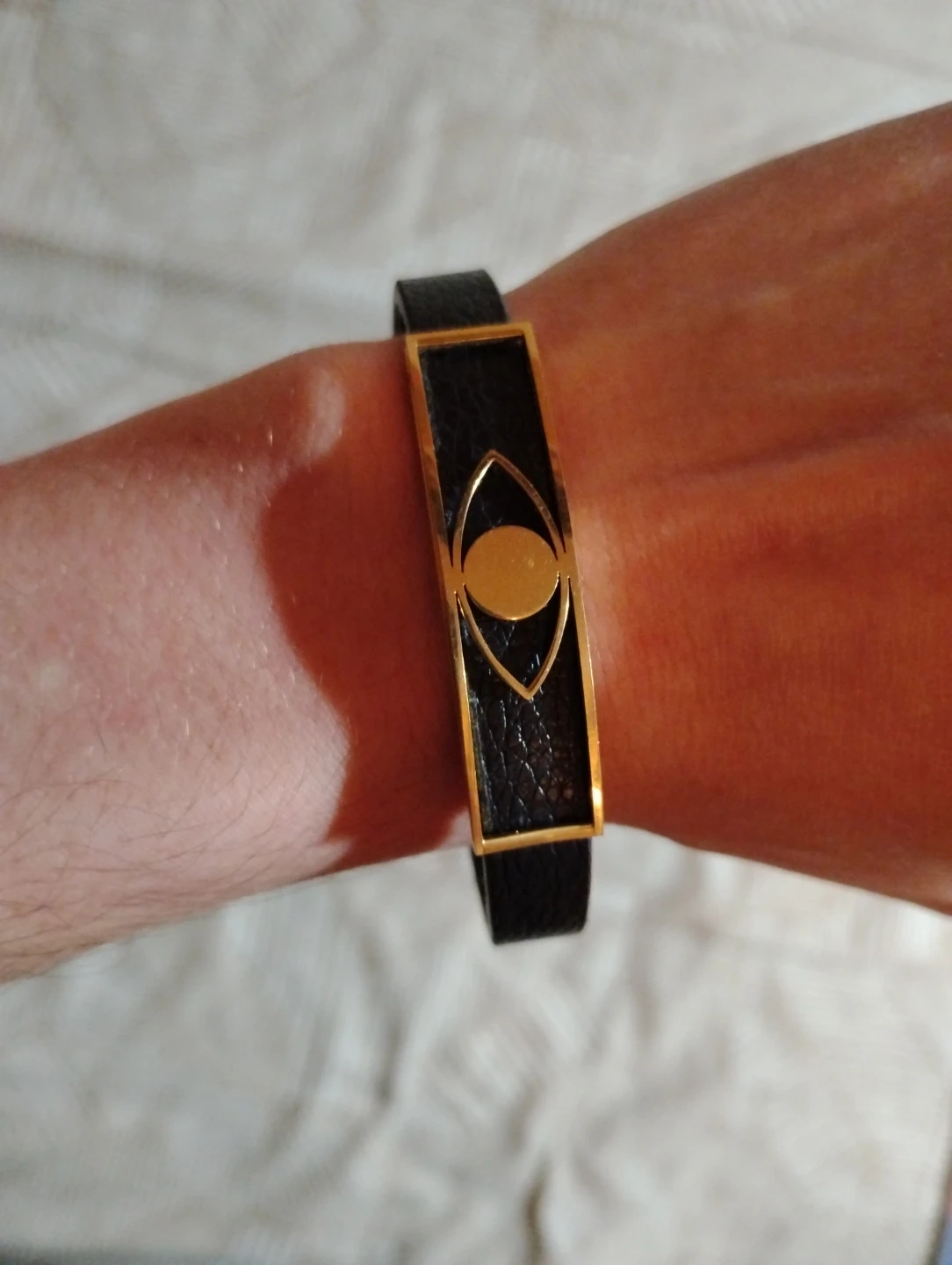 Cool black leather bracelet with a gold-toned metal accent featuring an eye design. It's got a secure clasp for easy wear. This bracelet adds a unique touch to any outfit!