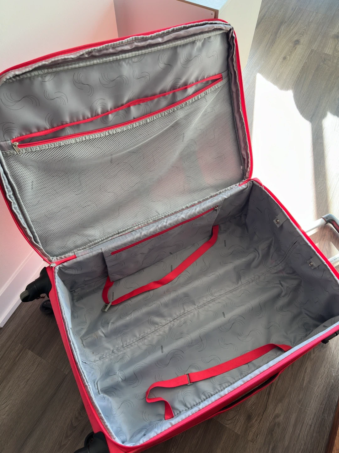 This is a pink suitcase from American Tourister. It features interior straps for securing clothes and zippered compartments for organization. The retractable handle and wheels make it easy to transport.