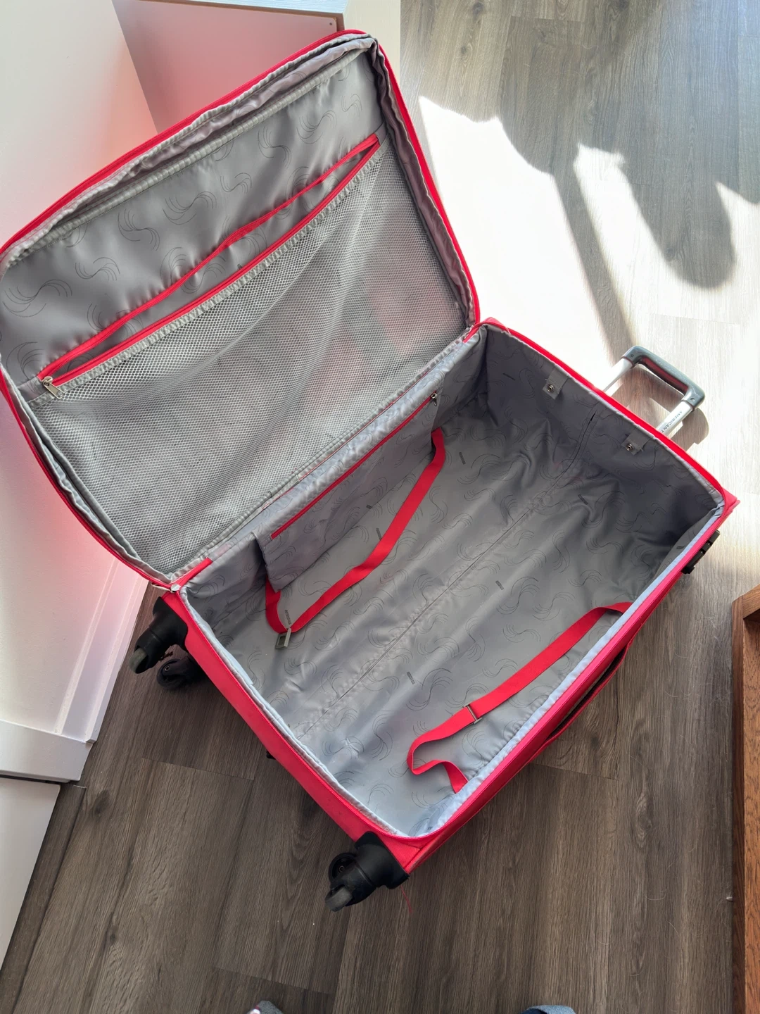 This is a pink suitcase from American Tourister. It features interior straps for securing clothes and zippered compartments for organization. The retractable handle and wheels make it easy to transport.