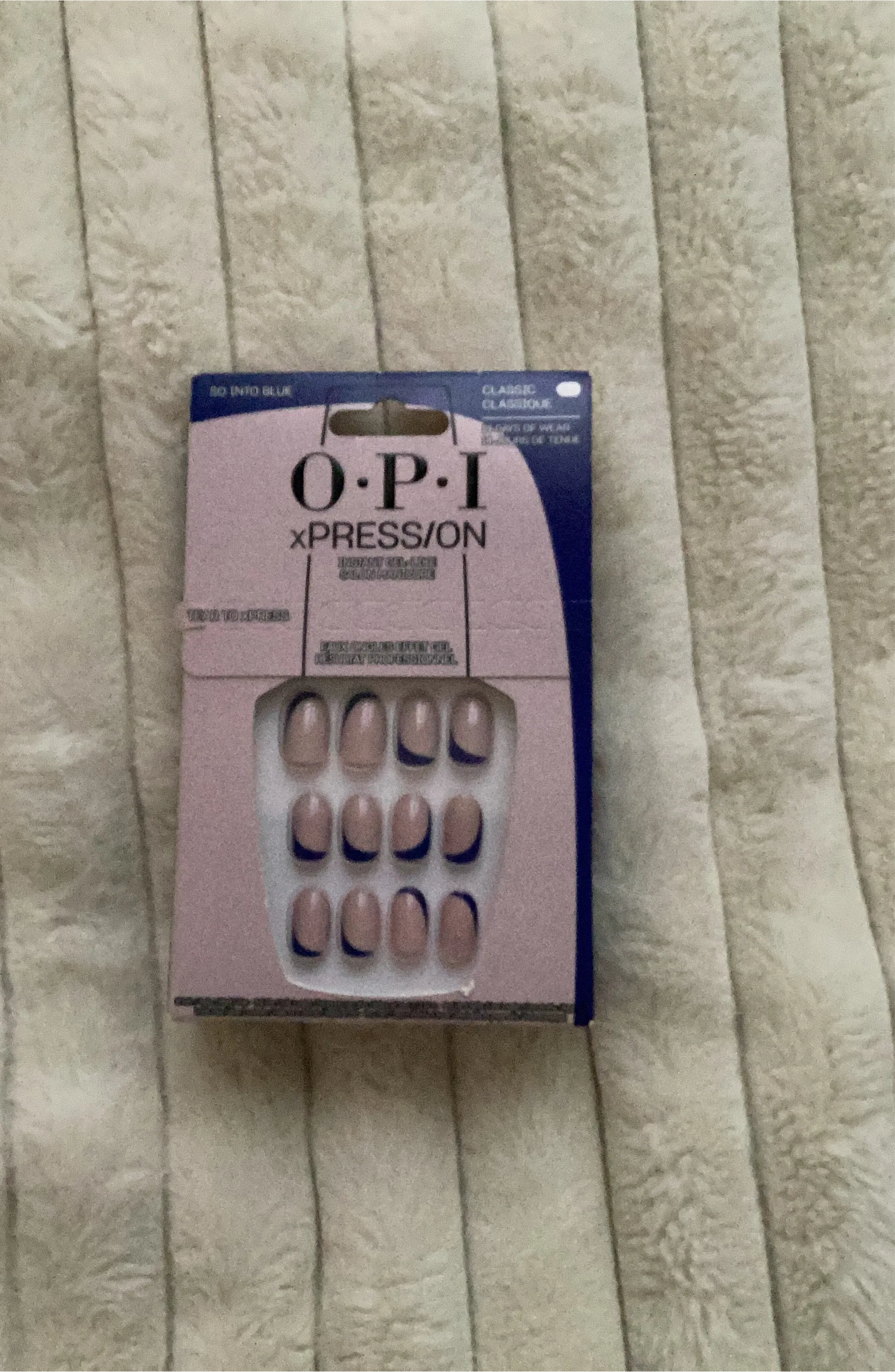 OPI XPRESS/ON press-on nails in "So Into Blue". These classic French-style nails offer a gel-like finish for a professional result. They're designed for easy application and up to 7 days of wear.