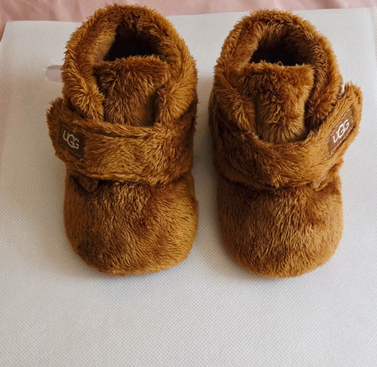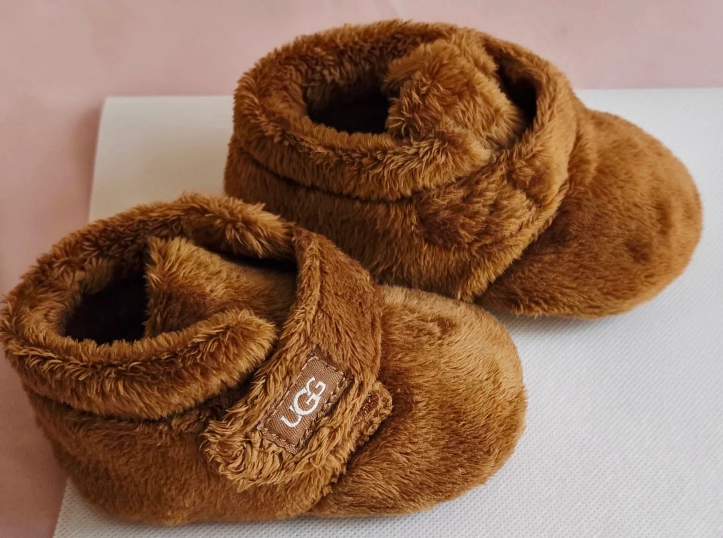 Super soft UGG baby booties in a cozy brown color. These fuzzy booties are perfect for keeping little feet warm. They feature easy hook-and-loop closures.