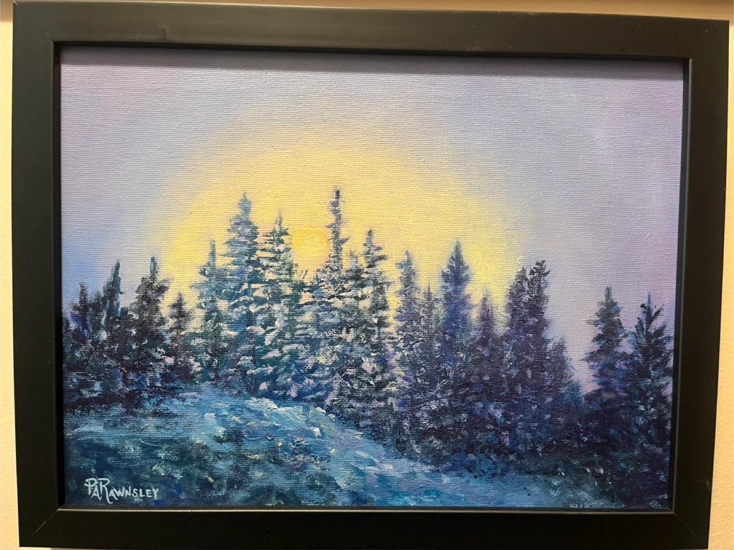 “Evening Glow”, oil on canvas, 9x12, by a local artist (seller). Framed to 10x13 in a black wood frame.