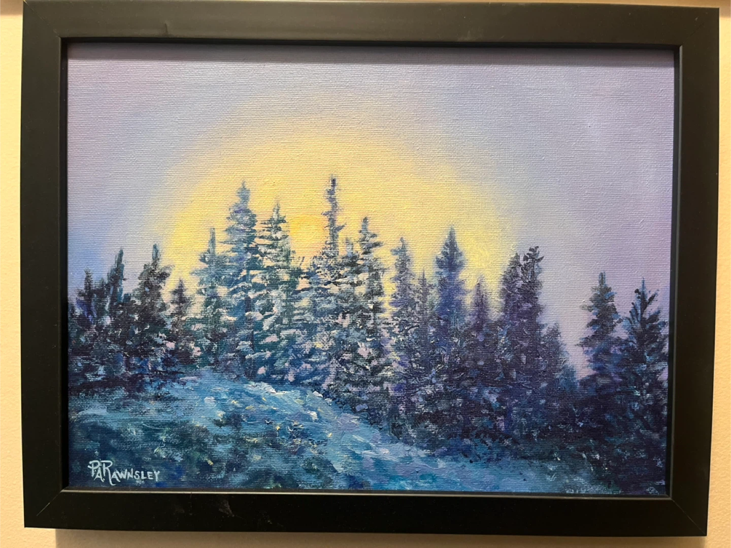 “Evening Glow”, oil on canvas, 9x12, by a local artist (seller). Framed to 10x13 in a black wood frame.